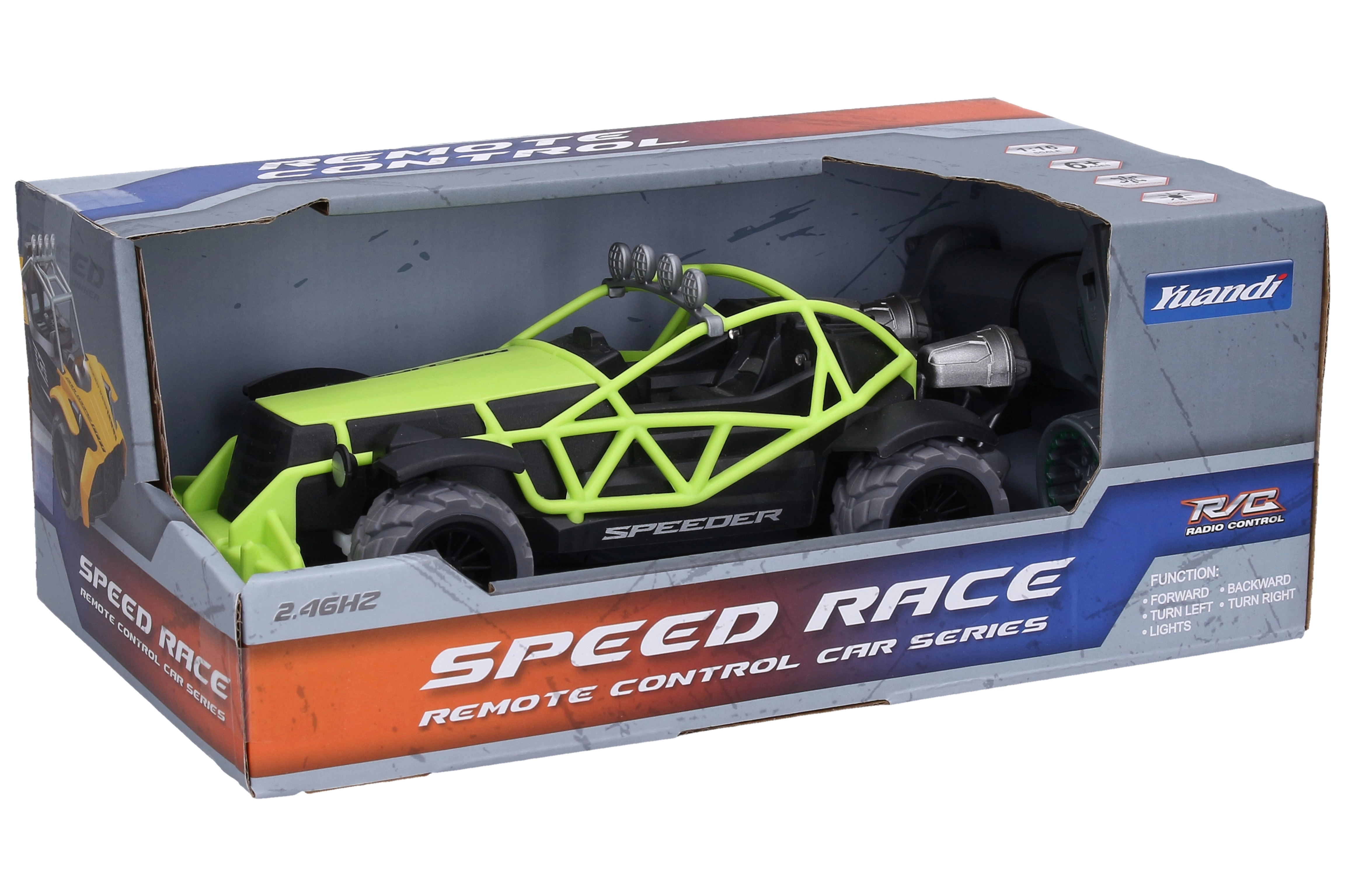 Nyd actionfyldt kørsel både inde og ude med Buggy Speeder RC. Den kompakte længde på 22 cm sikrer fremragende manøvredygtighed, mens 2,4 GHz-frekvensen giver jævn styring uden forstyrrelser, selv når flere biler kører samtidig. Pistolcontrolleren ligger godt i hånden, og lyseffekterne giver kørslen det rette pift.