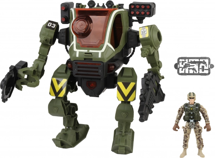 Pakken indeholder en detaljeret pilotfigur (11 cm), som kan placeres ved robotten for endnu mere autentiske legescenarier. Robotten måler 25 × 11 × 26 cm og er klar til brug med det samme – 2× AG13-batterier medfølger.