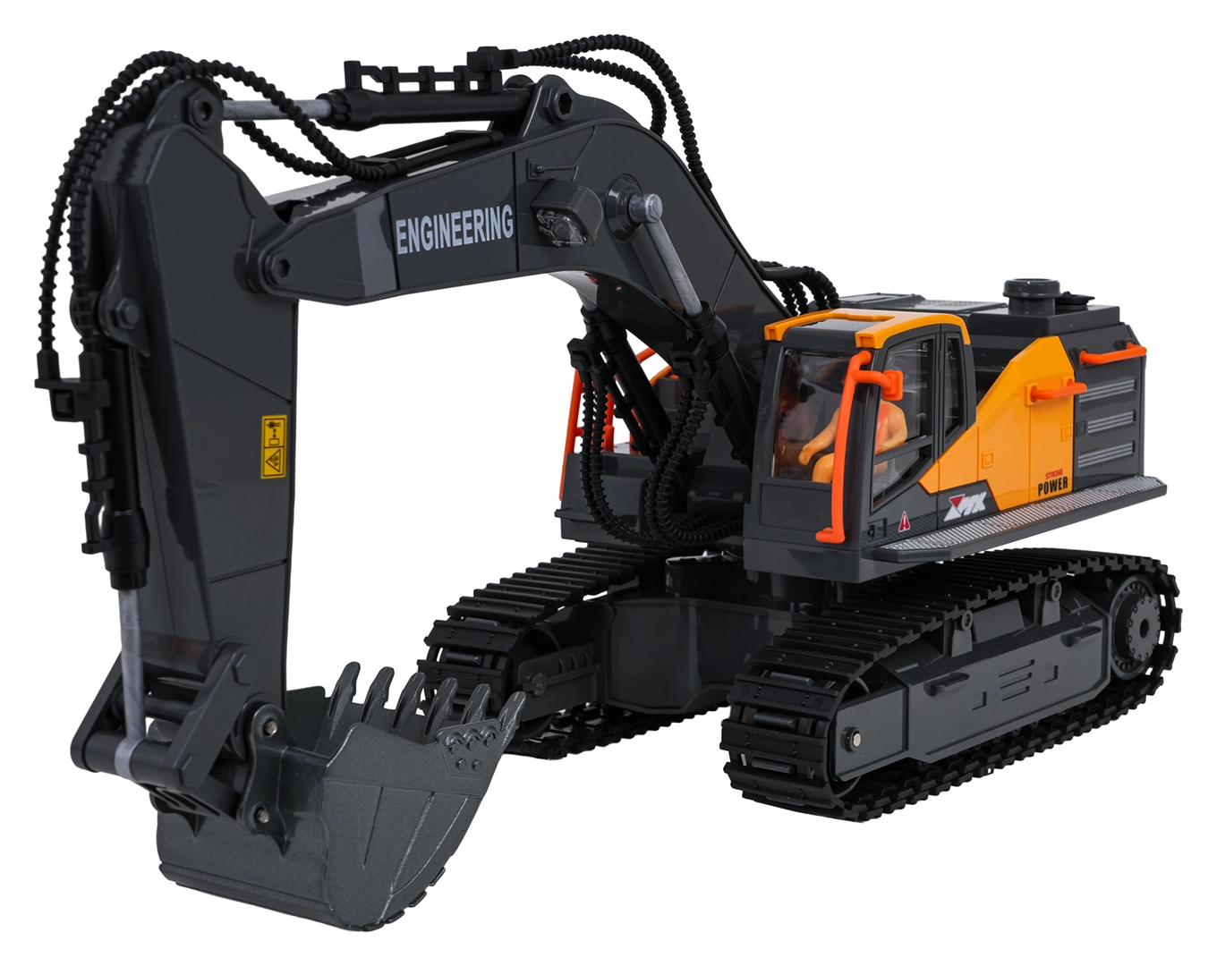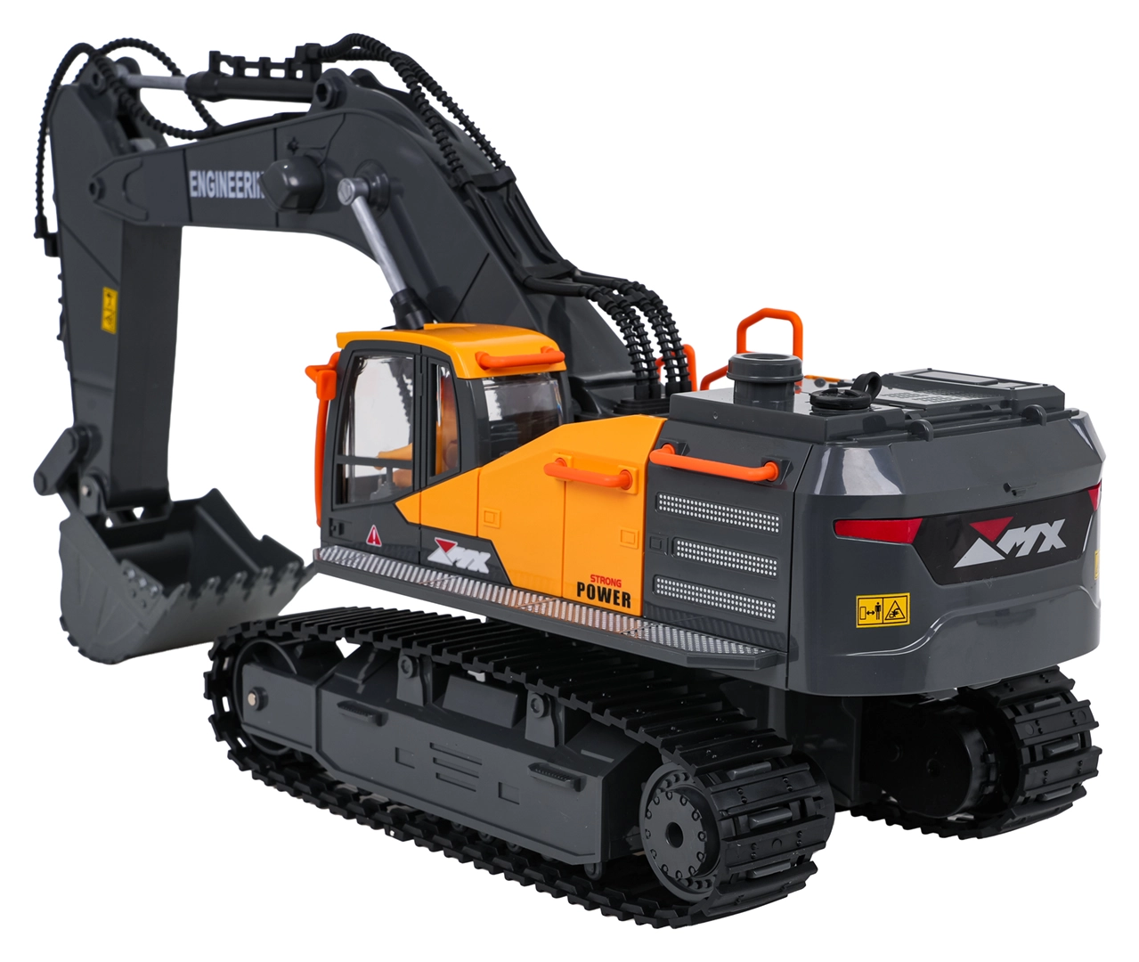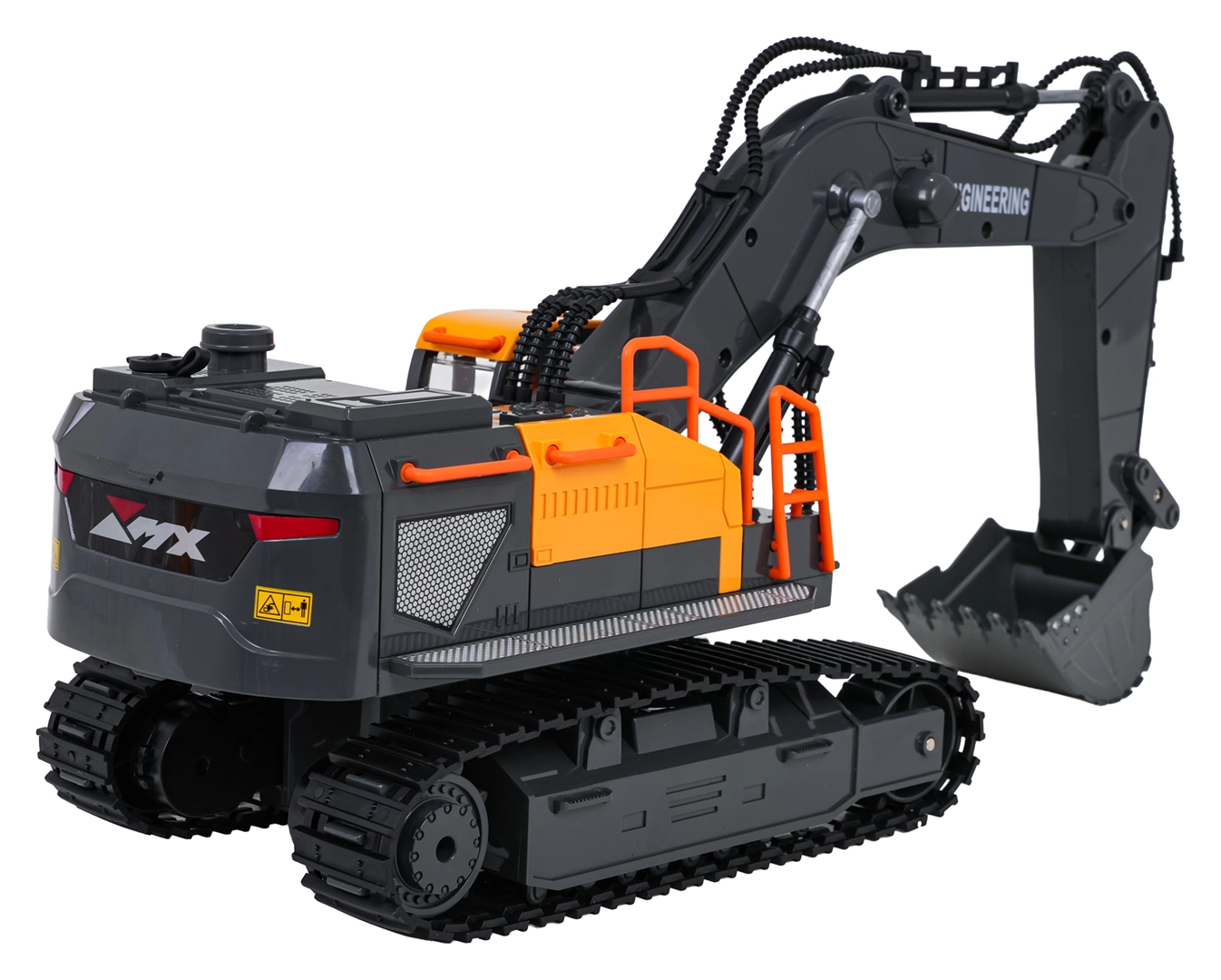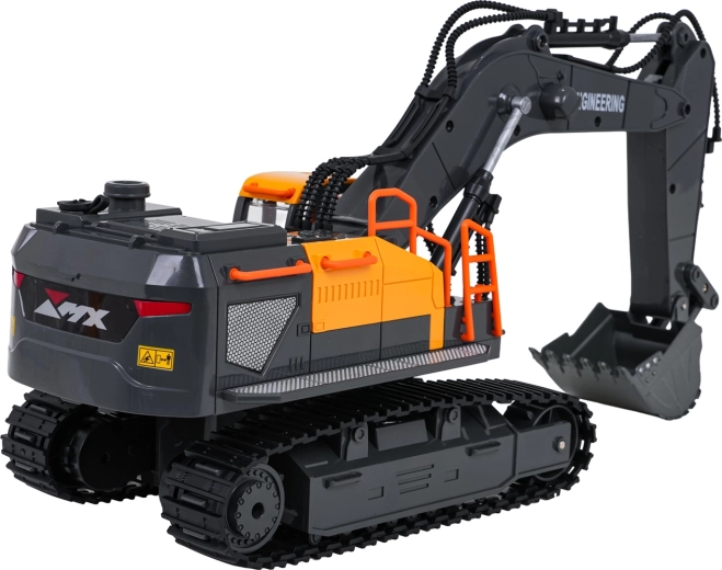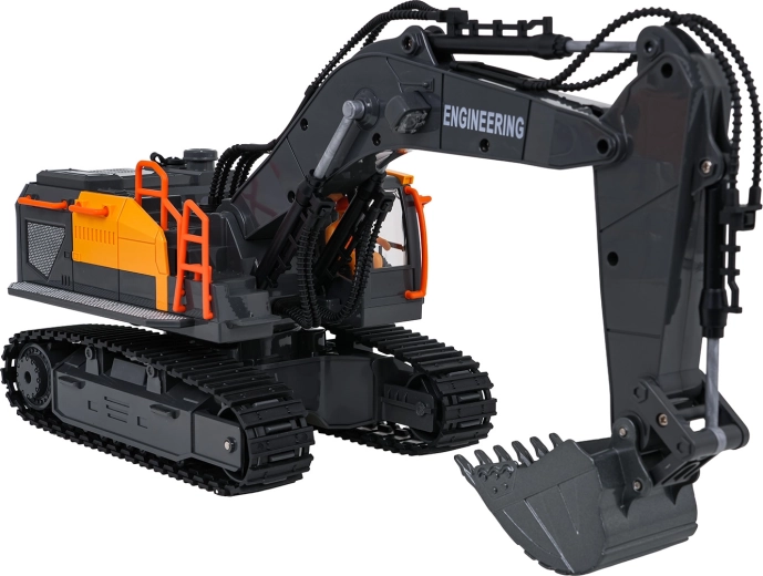 Denne detaljerede, fjernstyrede gravemaskine giver børn en autentisk byggeoplevelse. Med metal-skovl kan den skovle og tømme materialer, armen bevæger sig op og ned, og kabinen roterer 360°. Bageste LED-belysning og røg-effekt efter påfyldning af vand øger legets atmosfære.