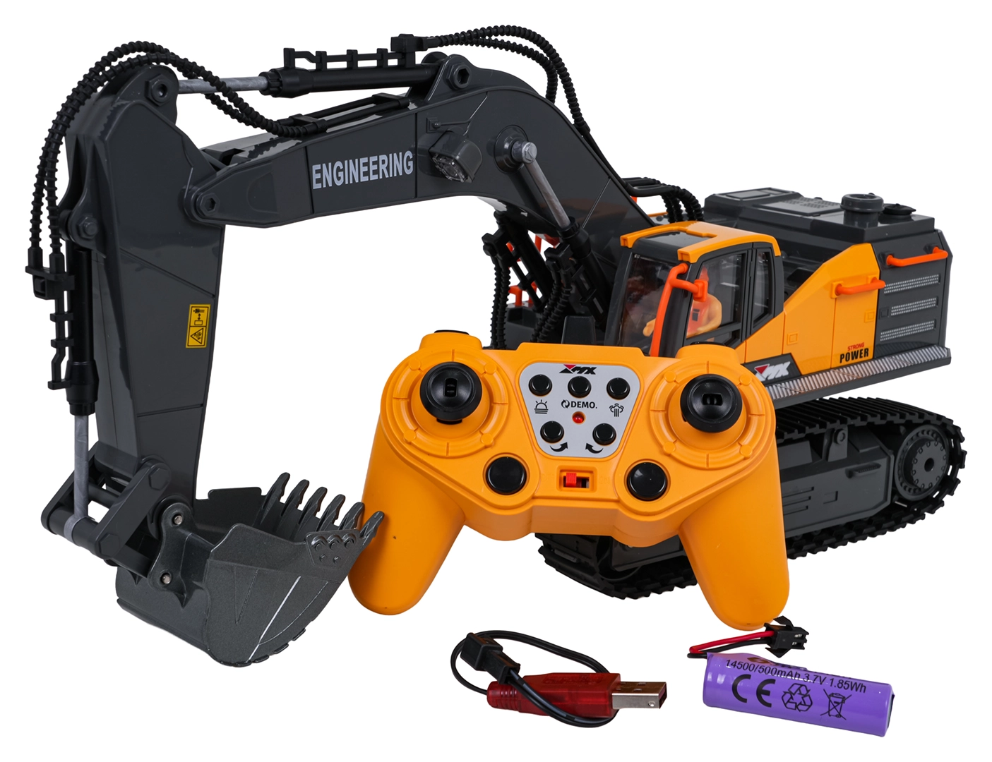 Styring på 2,4 GHz sikrer stabil rækkevidde uden forstyrrelser; gravemaskinen kører frem, tilbage, til højre og venstre. Der er demo-tilstand, drifts- og bak-lyde med mulighed for at slukke for lyd og lys. Strømforsyning via medfølgende genopladeligt batteri 3,7 V, opladning via USB.