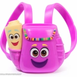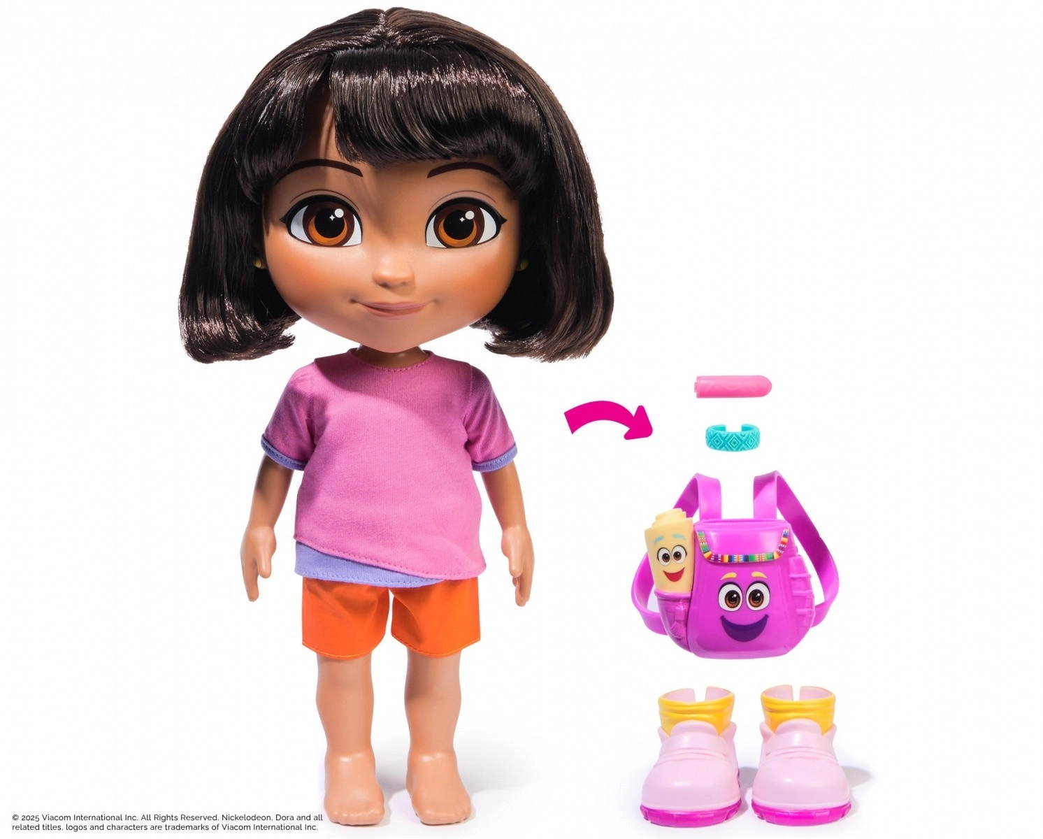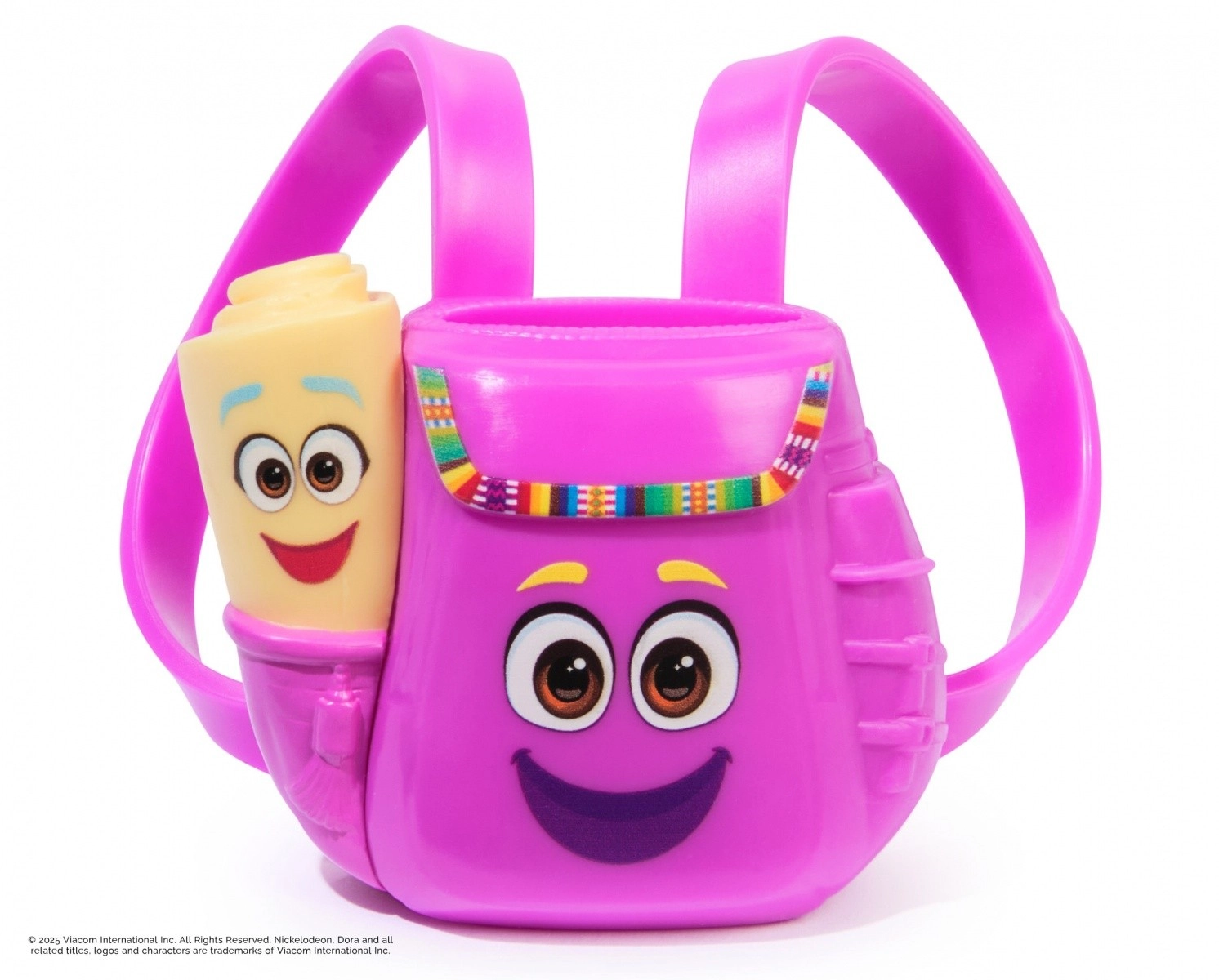 Der medfølger den ikoniske lilla rygsæk med et smilende ansigt – den øverste del åbnes ved tryk, klar til små skatte fra ekspeditioner. Dukken er designet til imaginativ leg, understøtter finmotorik og naturlig indlæring af ordforråd.