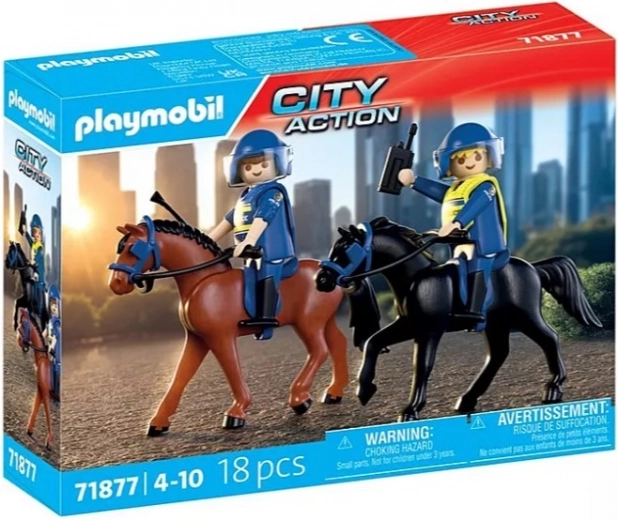 Oplev den dynamiske verden af bypatrulje med PLAYMOBILs rytterduo. Sættet indeholder detaljerede figurer af en politibetjent og en politikvinde i blå uniformer samt to heste (brun og sort) med komplet seletøj. Børn får realistiske scenarier takket være bevægelige led, aftagelige hjelme og veste samt autentisk tilbehør som radio og ridepisk.