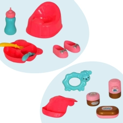 Med følger en lege- og aktivitetsmåtte med bøjle og hængende legetøj, tasker samt tilbehør til fodring og pleje – ideel til rolleleg som forælder.
