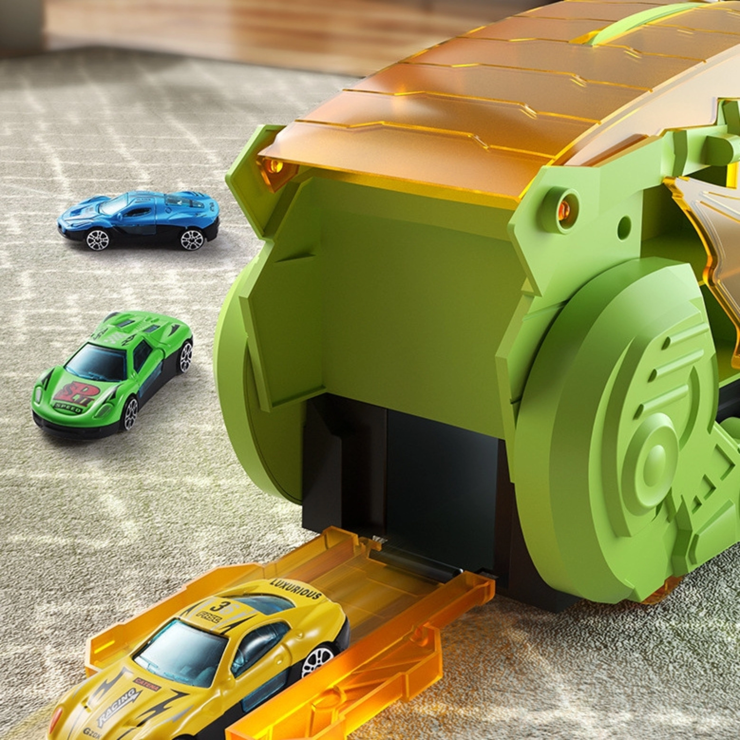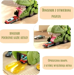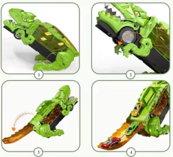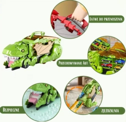 Dinosaurtrækkeren forvandles på et øjeblik til en actionfyldt legeplads: fold den orange rampe ud, læs bilerne på, og lad dem suse ud af den åbne dinosaurmund. Takket være det praktiske håndtag og de indvendige rum kan du nemt opbevare alle biler og tage dem med. Livlige farver og markante detaljer stimulerer fantasien og indbyder til leg.