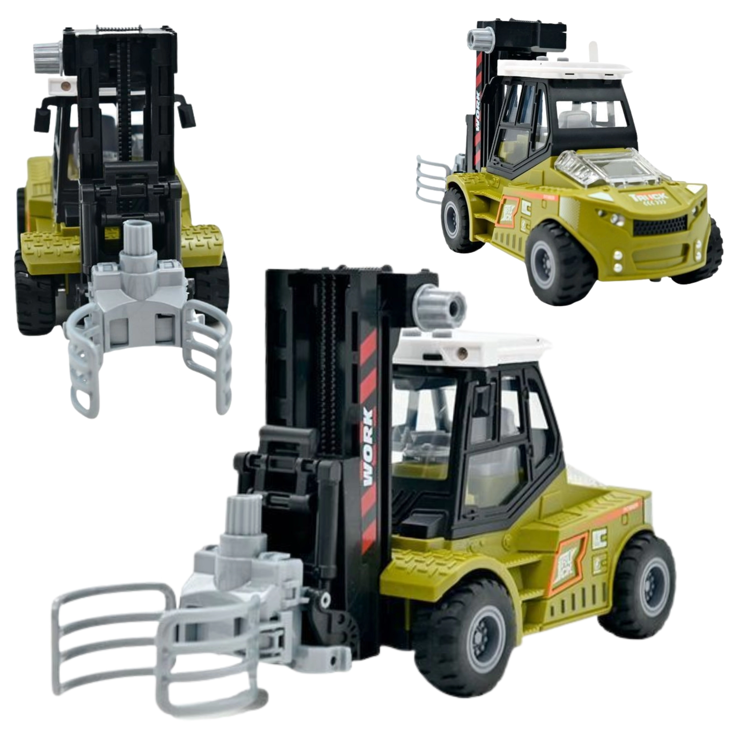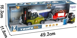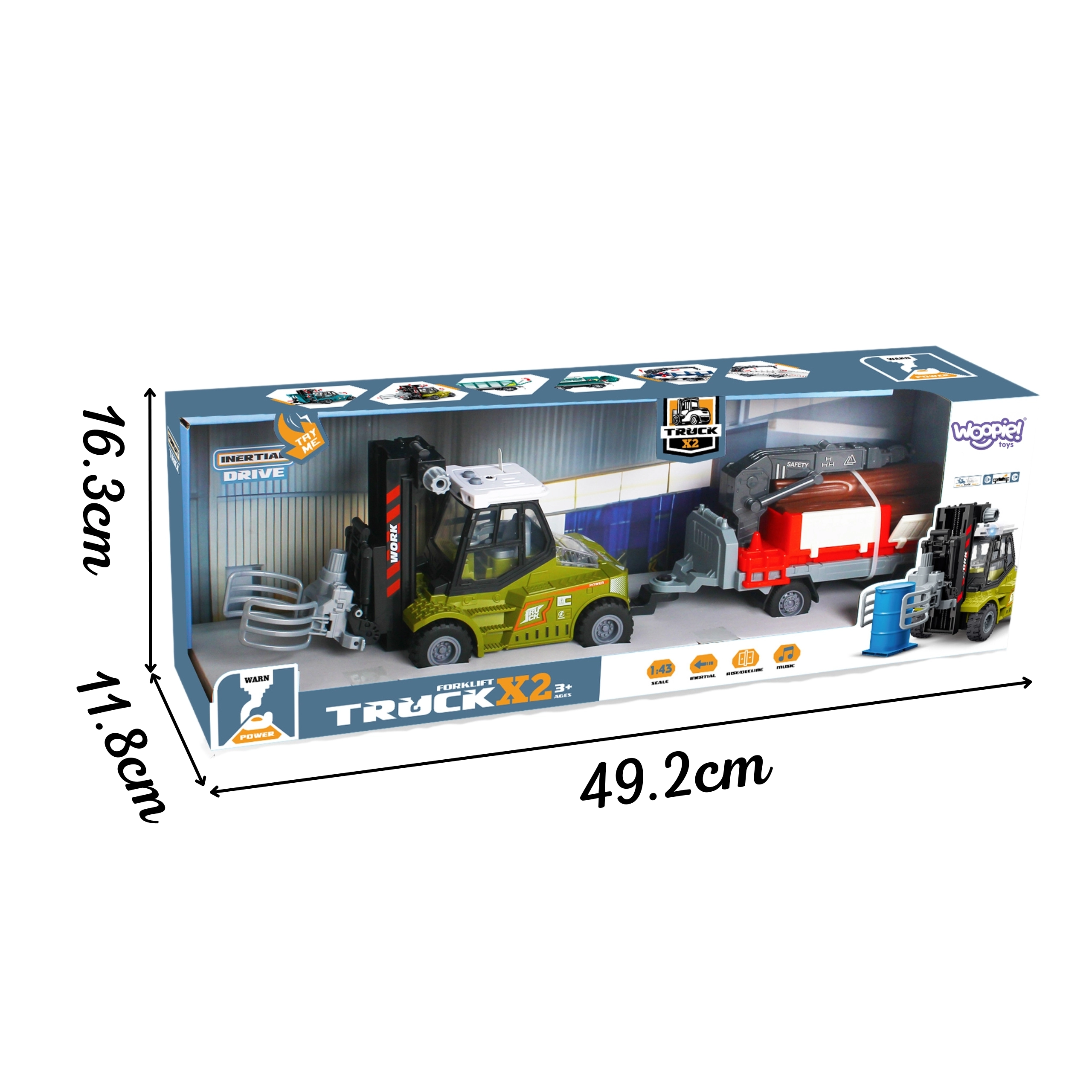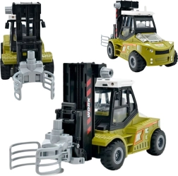 Den realistiske model i skala 1:43 vil glæde små entusiaster af bygge- og transportmaskiner. Gaffeltrucken har friktionsdrev – skub den let, og den kører fremad. Den bevægelige arm med grab gør det muligt at løfte og flytte træstammer, mens anhængeren med åbne sider gør lastning og losning lettere.