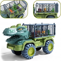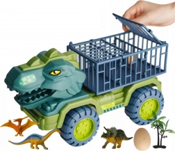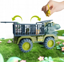 Pakken indeholder: dinosaurtransportør, 15 dinosaurfigurer, dinosauræg, dekorationer (træ, sten).