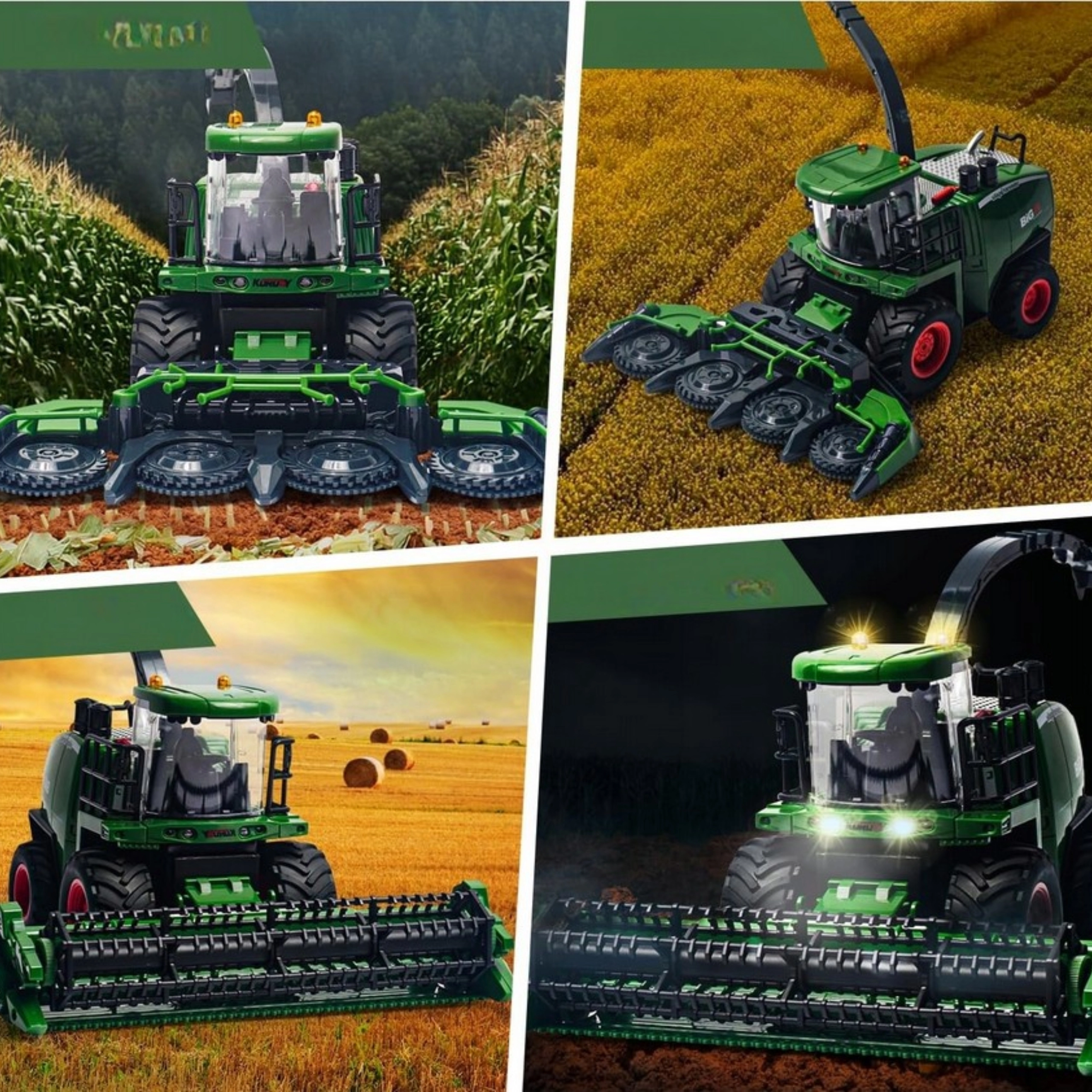 Oplev en realistisk RC-mejetærsker med detaljeret udførelse, forreste LED-lys og autentiske lyde. Det roterende skærebord drejer under kørsel og kan foldes til transportposition, så høstlegen føles helt ægte. Røg-effekten med enkel vandpåfyldning forstærker oplevelsen af landbrugsarbejde.