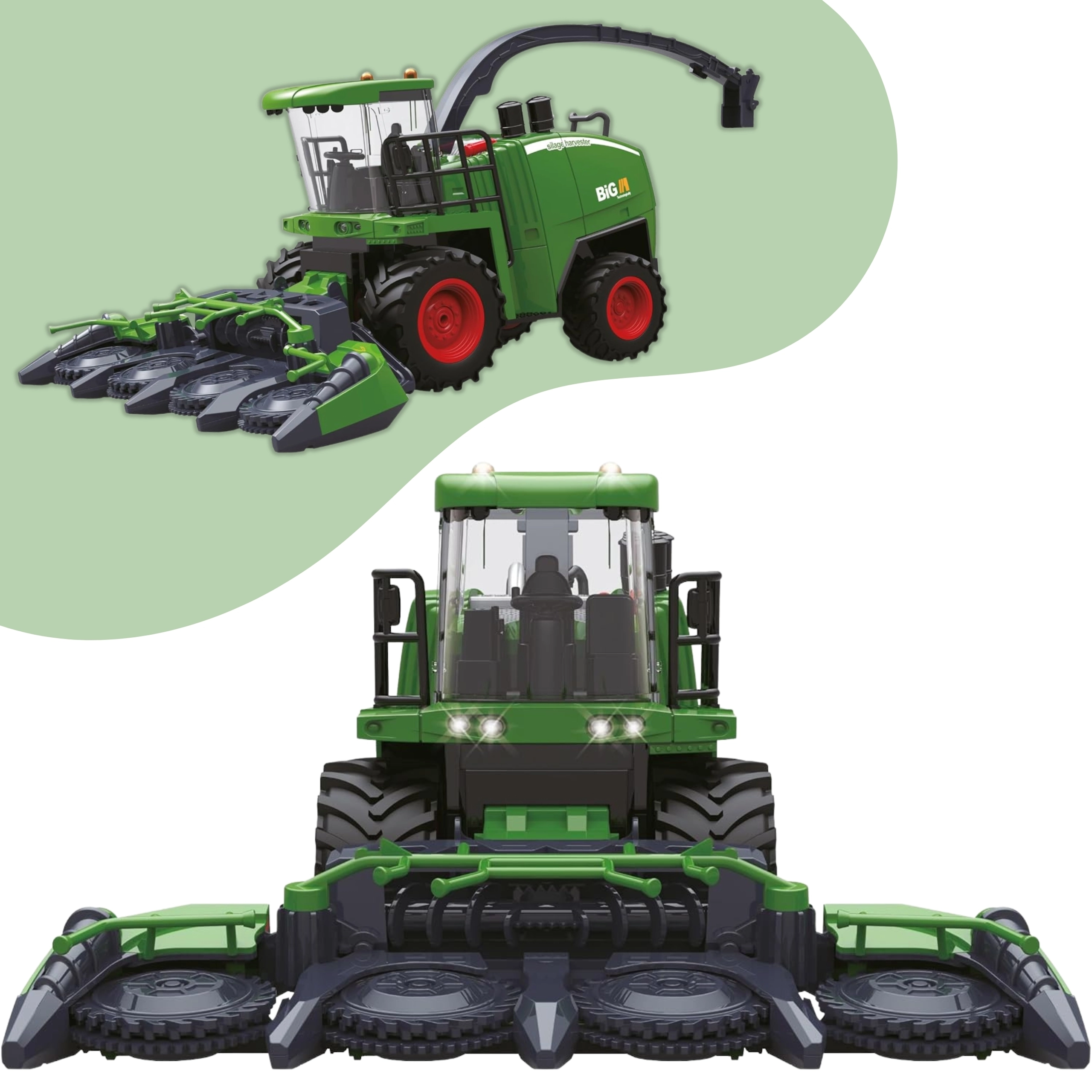 Det forreste skærebord roterer automatisk under kørsel og kan foldes til transportposition. Store hjul, førerkabine og forlygter giver modellen et autentisk udseende.
