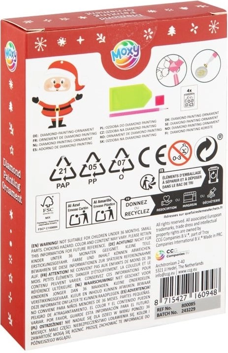 Skab din egen glitrende juledekoration med MOXY-sættet. Dette kreative sæt indeholder 1 ornament med SANTA-motiv, selvklæbende overflade og farvede sten. At sætte sten efter tal er nemt selv for begyndere, det udvikler finmotorik, koncentration og giver glæde ved julehygge og kreativitet.