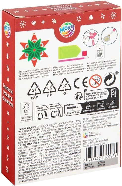 Skab din egen glitrende juledekoration med MOXYs kreative sæt. Den enkle diamantmaleteknik med talmønster er nem for både børn og voksne, fremmer kreativitet og finmotorik, og resultatet er en strålende stjerne, der pynter på juletræet, kransen og i hjemmet.
