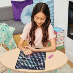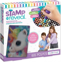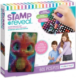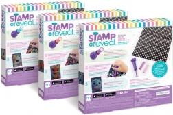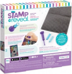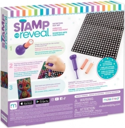 Sættet Stamp to Reveal giver en let og samtidig vanedannende måde at skabe effektfulde prikkede billeder på. Det er blot at sætte stemplet til tallet på den prikkede kassette, finde det samme tal på plakaten, justere cirklerne og stemple. Med hvert aftryk afsløres motivet mere, og den færdige farverige plakat med en strålende drage er klar til at blive udstillet.