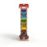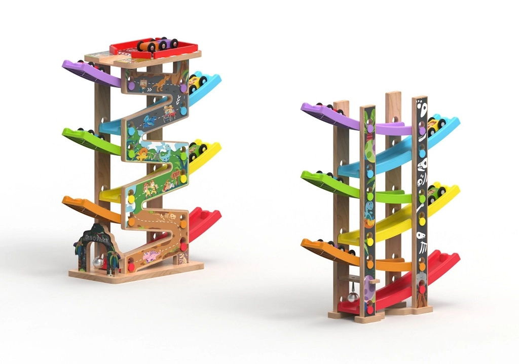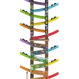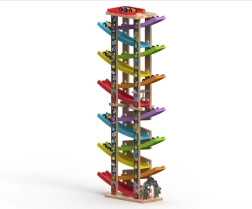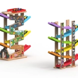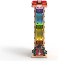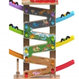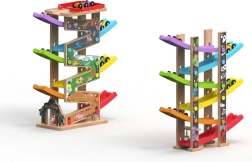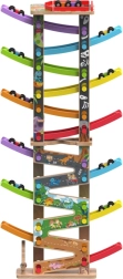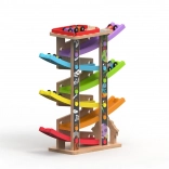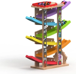 Denne vertikale træ racertårn med 6 farvede ramper giver dynamisk leg baseret på tyngdekraft. Børn placerer en bil øverst og ser den suse ned gennem de enkelte niveauer, sving og små broer. Takket være den stabile konstruktion og de kompakte mål passer banen både på børneværelset og i legerummet og holder til intensiv brug.