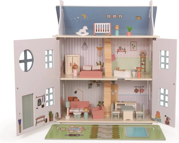 Dukkehuset er lavet af kvalitets træ og suppleret med tekstil- og filtdele. Møbler og figurer er inkluderet, så børn kan begynde at lege med det samme. Åbne paneler giver let adgang til interiøret, og detaljerede vægprints understøtter realistisk leg. Den robuste konstruktion sikrer lang holdbarhed og sikker brug.