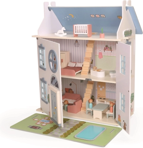 Dette tidløse trædukkehus er designet til fantasifuld leg for børn fra 3 år. Det byder på tre etager med rummelige værelser – et moderne køkken, badeværelse, hyggeligt soveværelse, stue og et børneværelse på loftet. Den forreste del af taget kan tages af, vendes og lægges foran huset, hvilket skaber en have med pool og siddeplads.