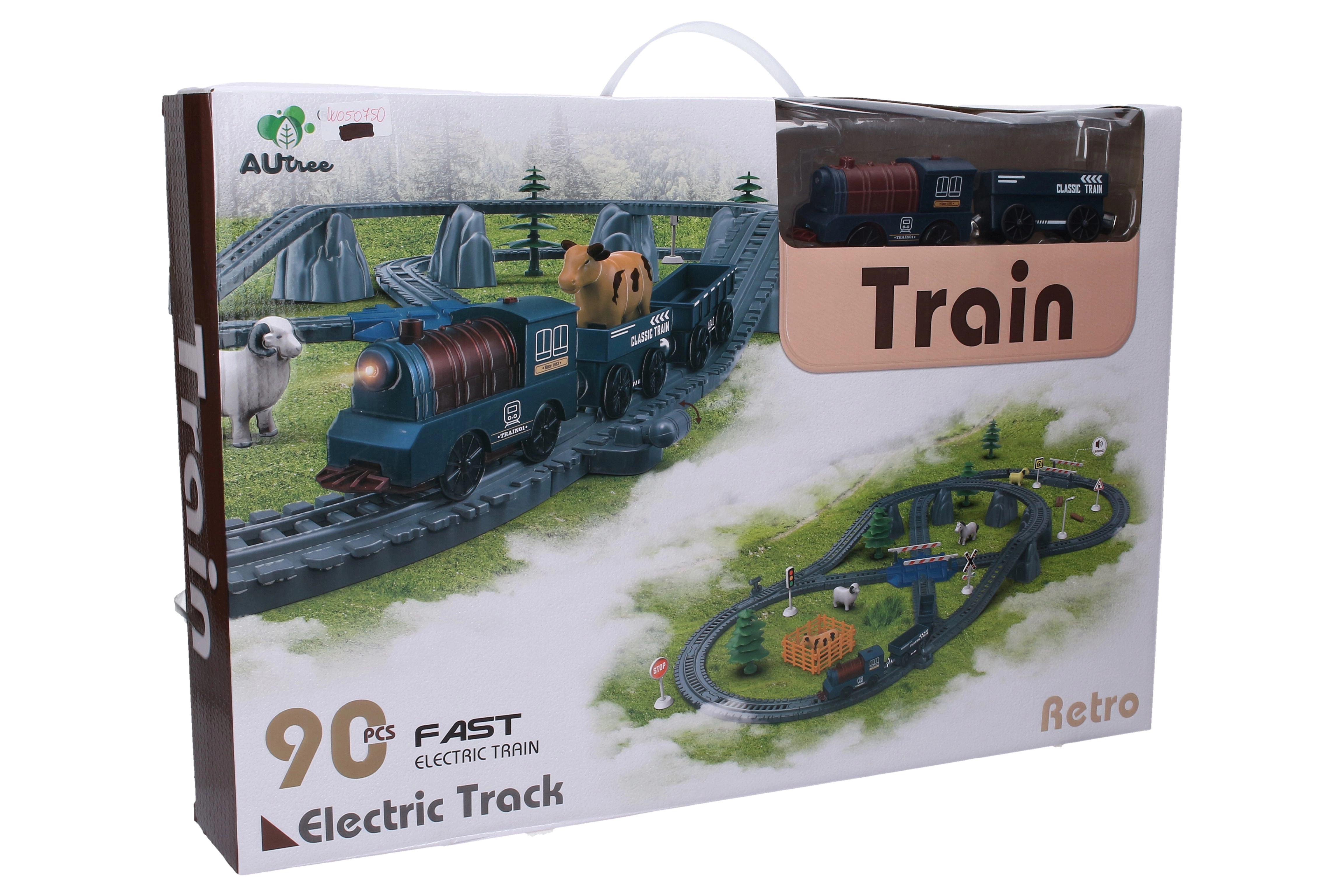 Den sjove togbanesæt med målene 112 × 61 × 7,5 cm vil glæde små togentusiaster. Sættet med 90 dele tilbyder sammenkobling af togvogne med magneter, lydeffekter og nem styring af kørselsretning via en kontakt på lokomotivet. Batteri 1× CR2032 (3 V) er inkluderet, lokomotivet kræver 1× AA (1,5 V) – medfølger ikke.