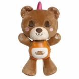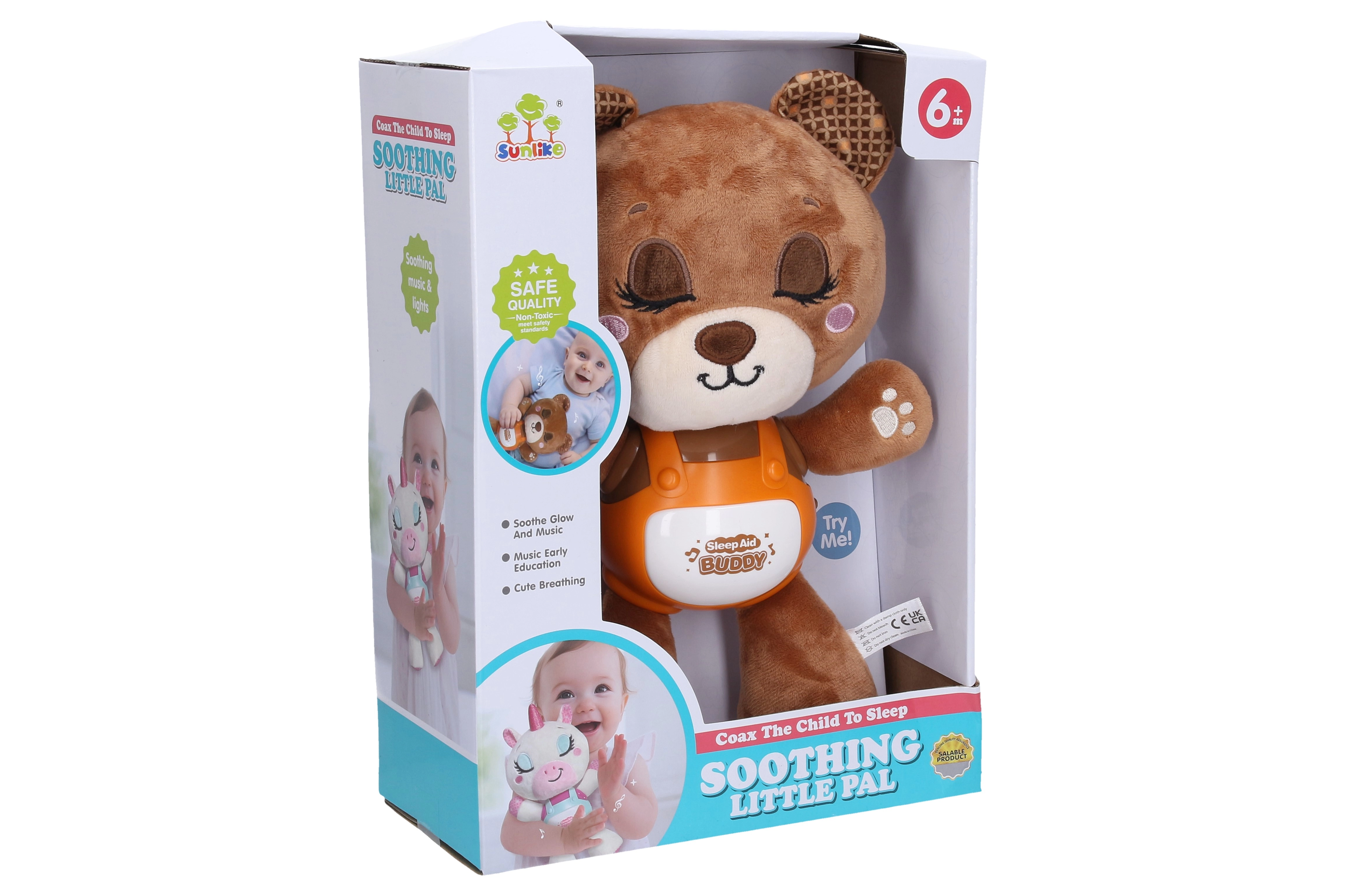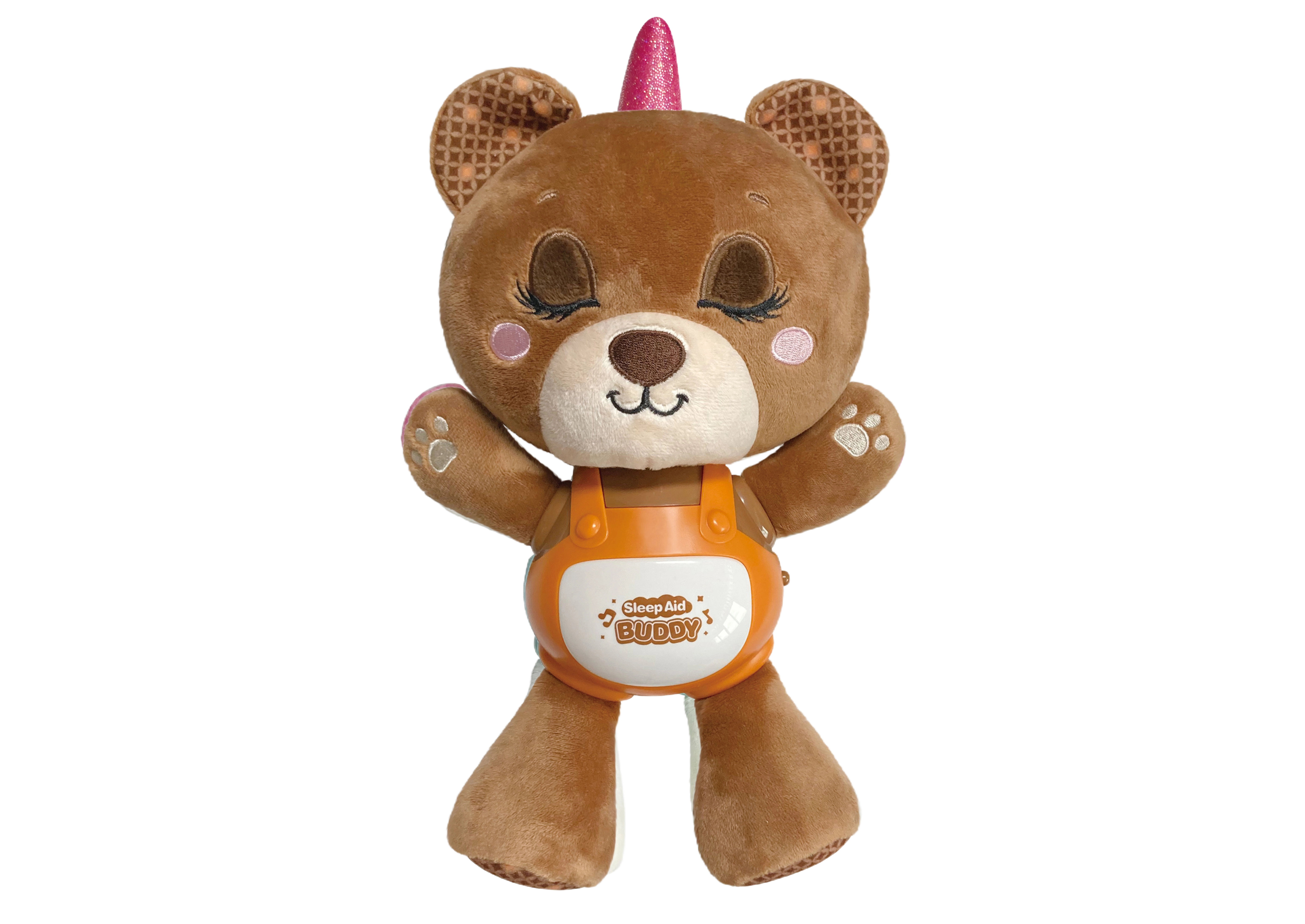 Den søde sovebamse på 29 cm hjælper børn med at falde roligt i søvn takket være en kombination af vuggeviser, beroligende musik, snorkelyde og et blidt natlys. Betjeningen er enkel – tryk på maven for at skifte mellem tilstande. En praktisk on/off-knap sidder på siden.