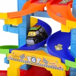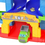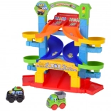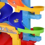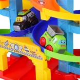 Farverig spiralracerbane med flere niveauer og to søde biler, der byder på timevis af leg og udvikling. Takket være nem montering og sikker udførelse kan børn nyde at se bilerne suse ned ad de snoede ramper. Sættet indeholder 2 køretøjer (politi og tipvogn), fleretagers drejerampe, startport og en robust plastkonstruktion ideel fra 18 måneder.