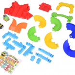 Banen er let at samle og bygge om, så man kan ændre layout og farver på segmenterne efter humør. Kvalitetsmaterialer, sikker konstruktion og afrundede kanter er tilpasset de mindste børn. I pakken finder du to biler – en politibil og en grøn tipvogn, der kører sikkert på de brede ramper.