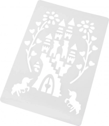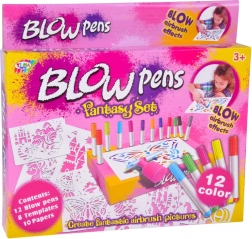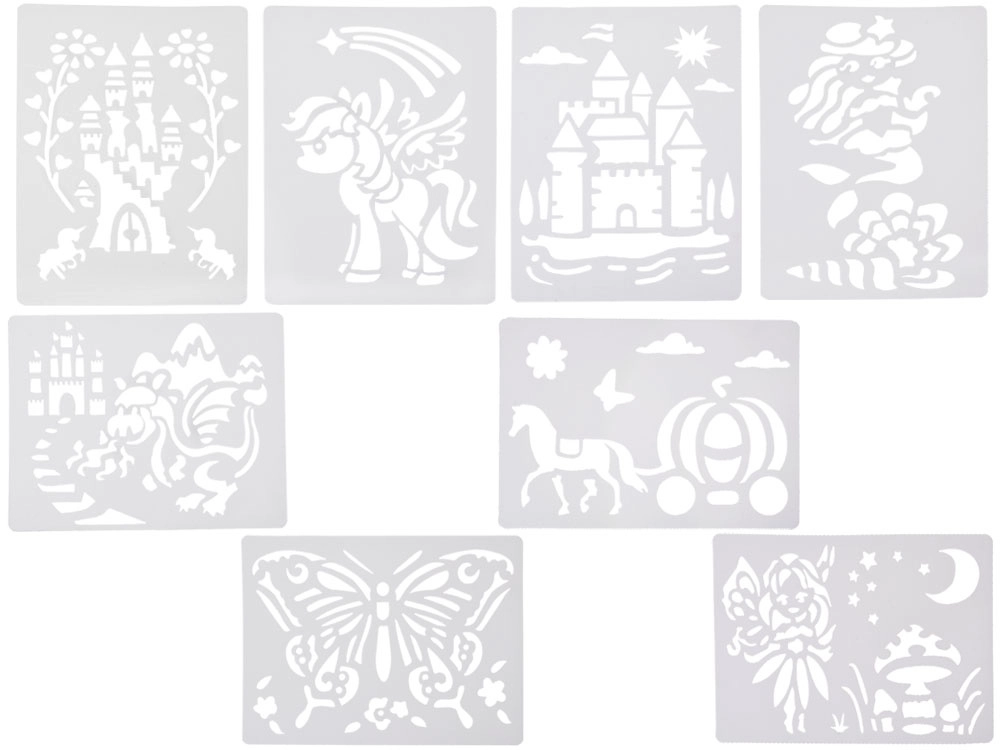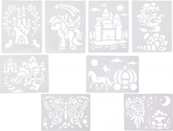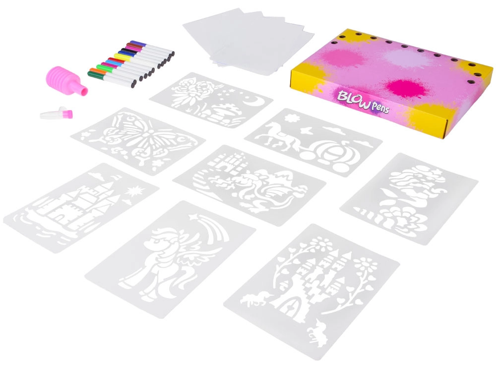 Pakken indeholder genanvendelige plastskabeloner med populære motiver (f.eks. sommerfugl, slotte, drage, havfrue, hest med vogn, skovfee, hest/føl), 12 farvede tuscher, 10 ark papir og en magisk pumpe. Skabelonerne skal blot tørre efter brug, så kan du skabe igen.