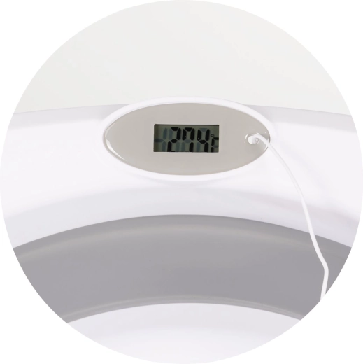 Det integrerede termometer hjælper med at indstille den ideelle vandtemperatur. Afløbshullet med praktisk prop gør tømningen hurtig uden at løfte badekarret.