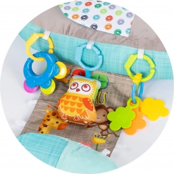 Ophængningsringe og bløde legetøj lokker til at gribe og ryste, hvilket understøtter finmotorik og sanseopfattelse.