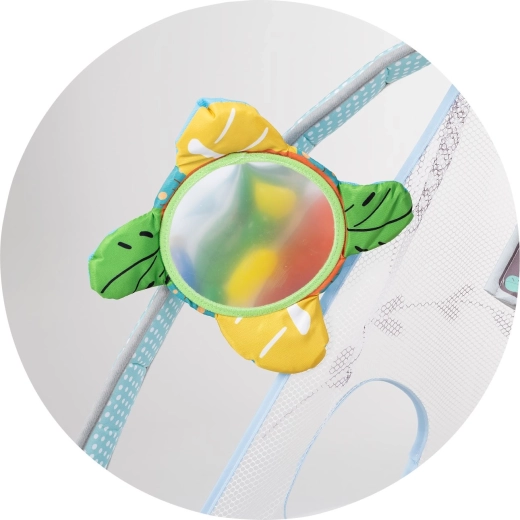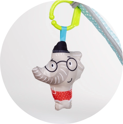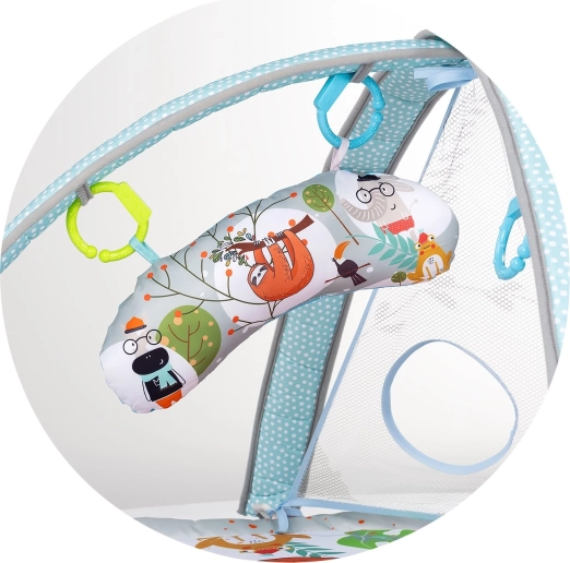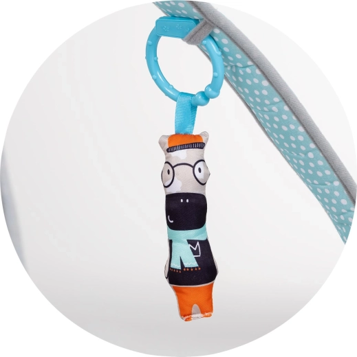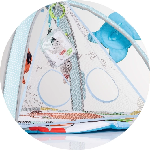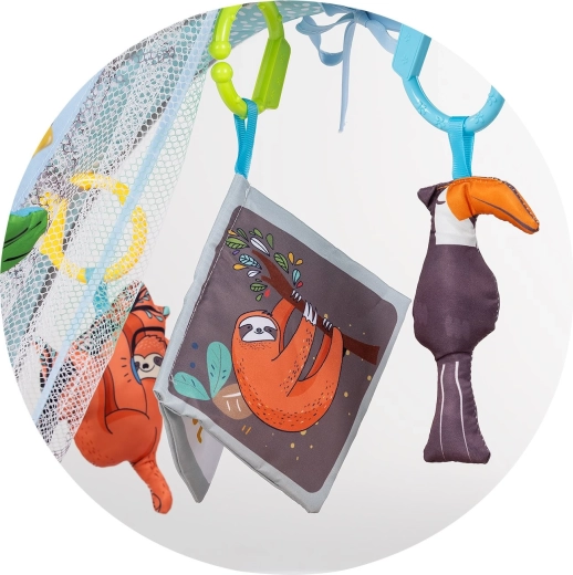 Ophængte legetøj, spejl samt lyd- og lyseffekter styrker syn, hørelse og nysgerrighed og motiverer babyen til at bevæge sig og række ud.