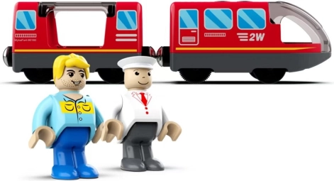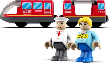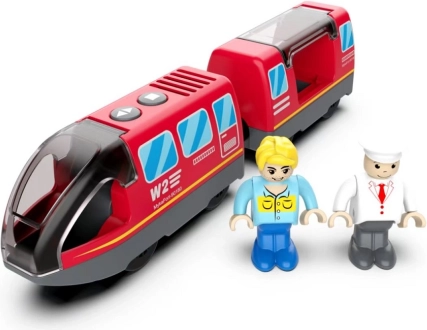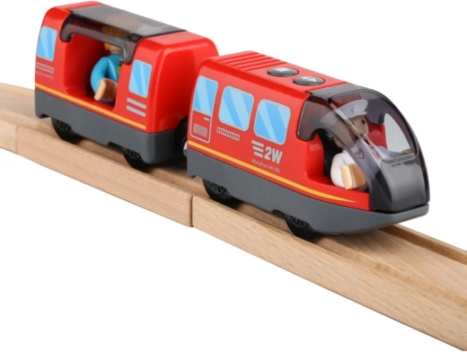 En moderne rød elektrisk togbane til børn med realistiske detaljer, automatisk batteridrevet kørsel og magnetisk sammensætning af vognene. Inkluderer 2 figurer til fantasifuld leg og er kompatibel med træsæt fra almindelige producenter. Fremmer finmotorik, koordination og fantasi.