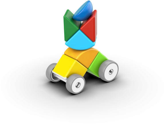 - 7 magnetiske elementer i forskellige former og farver, 4 hjul, 2 undervogne