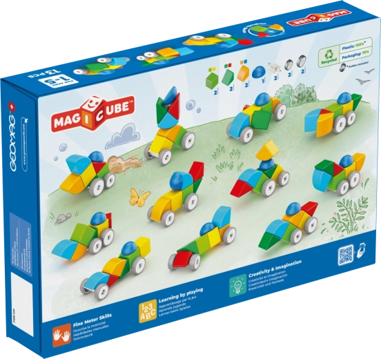 Oplev det sjove magnetiske byggesæt Geomag Magicube med 13 dele, som udvikler børns kreativitet, finmotorik og logiske tænkning allerede fra 1 år. Sættet af genanvendt plast indeholder magnetiske former og hjul med undervogne til at bygge farverige biler og andre kreationer.