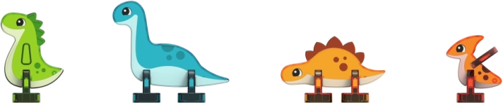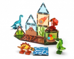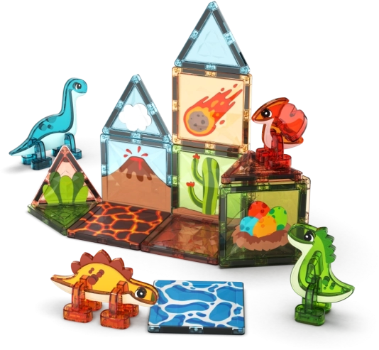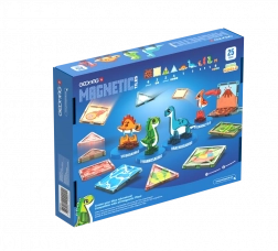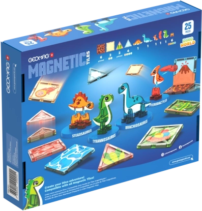 Pakken indeholder også 4 dinosaurfigurer, som giver legen en historie og forvandler hver konstruktion til et eventyr. Byggesættet er ideelt til den første introduktion til magnetismens principper samt udvikling af finmotorik og logisk tænkning.