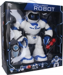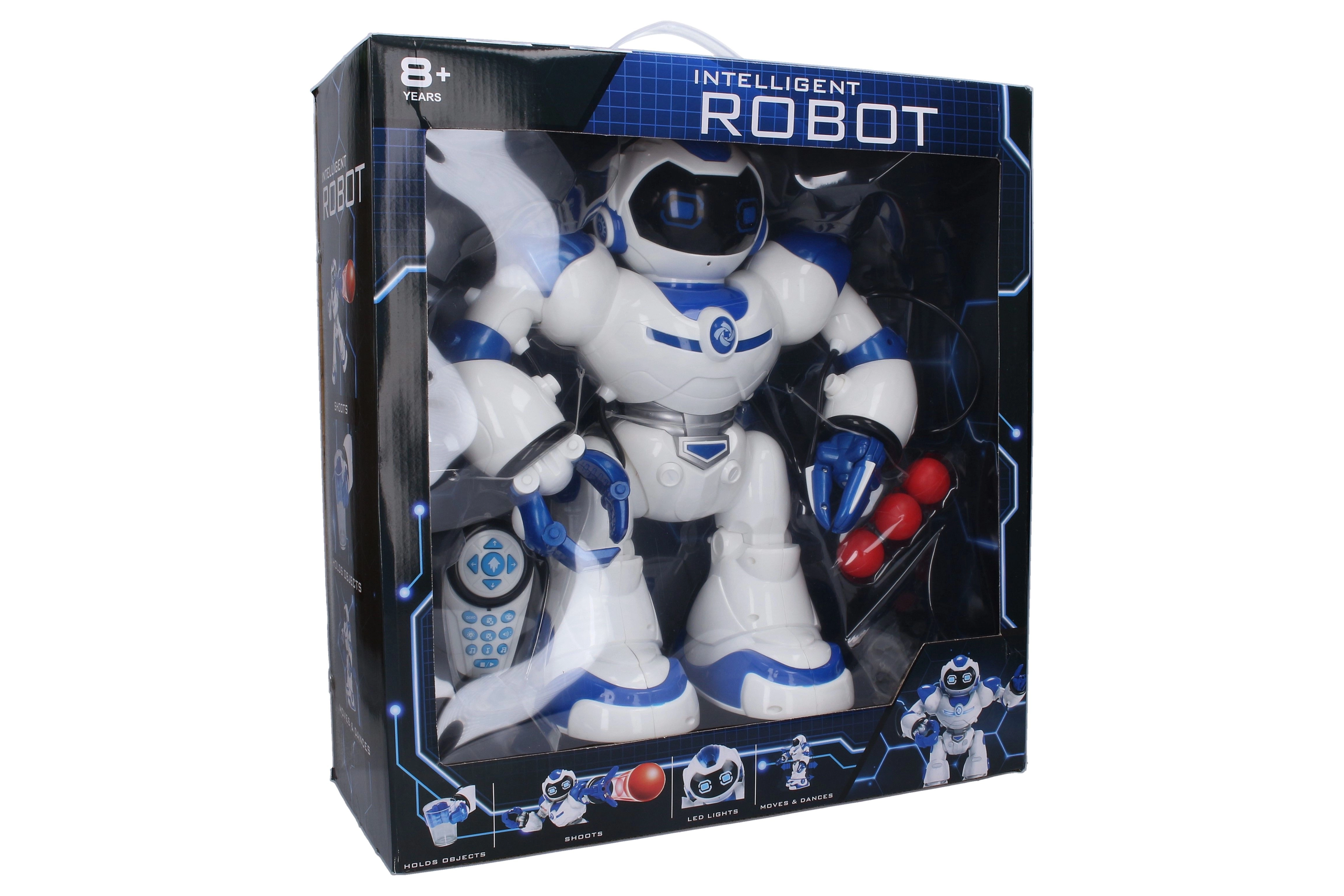 En sjov og interaktiv RC-robot på 40 cm, der skyder bolde, lyser, spiller og danser. Den tilbyder programmering af bevægelser, infrarød styring, lydstyrkekontrol og rige lys- og lydeffekter. Pakken indeholder 3 bolde.