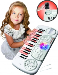 Sjovt børnekeyboard med integreret discokugle og mikrofon, der bringer musik og lyseffekter til ethvert værelse. Det tilbyder undervisningsfunktion efter lys, 37 tangenter, 22 demomelodier, 8 instrumenter og 8 rytmer. Desuden optagelse og afspilning, justering af tempo og lydstyrke samt stik til mobil/MP3. Ideelt til små, begyndende musikere.