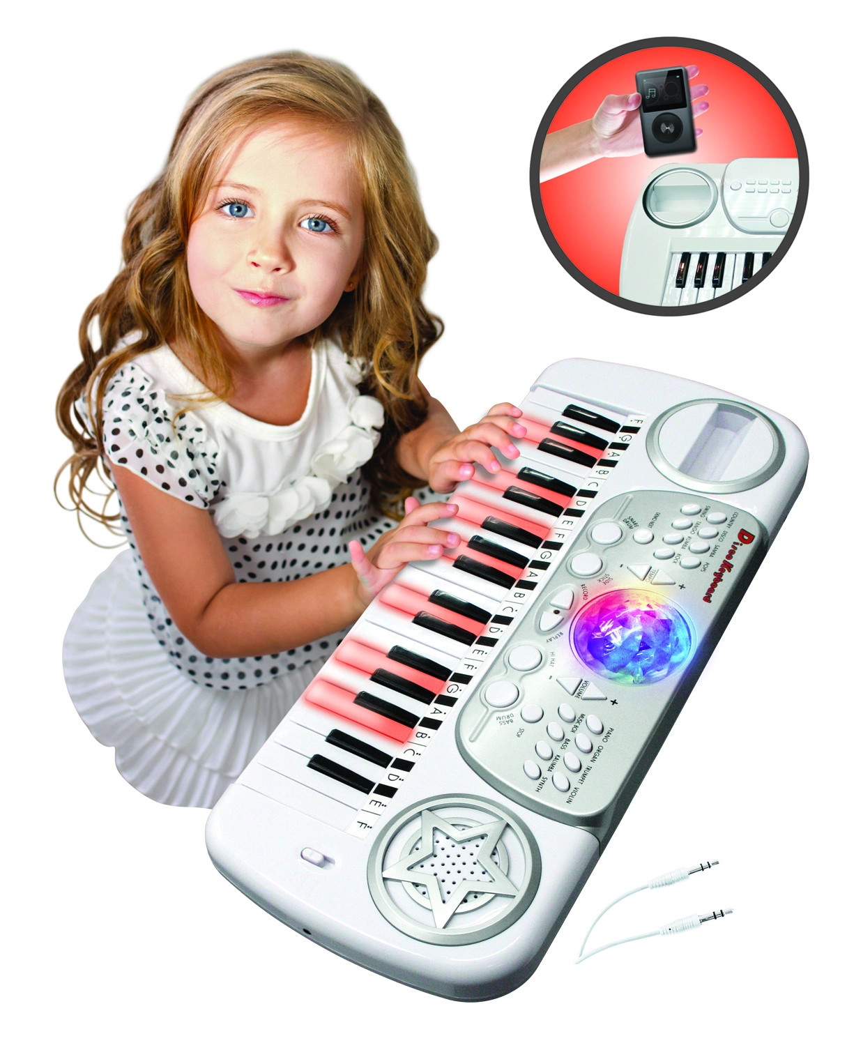 Med 37 tangenter, 8 indbyggede instrumenter og 8 rytmer kan børn afprøve forskellige lyde og stilarter. Justering af tempo og lydstyrke fremmer kreativiteten, og optagefunktionen med efterfølgende afspilning gør det muligt at lytte til egne kreationer. Ved at tilslutte en mobil eller MP3-afspiller via stikket kan de afspille yndlingssange og spille med.