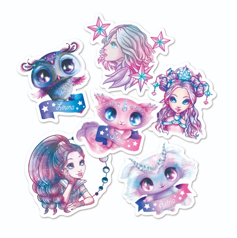 Pift dine ting op med originale NEBULOUS STARS motiver. Klistermærkerne er lavet af holdbar vinyl med blank overflade, præcise udskæringer og smukke illustrationer af piger og søde dyr med star & fantasy-elementer. Takket være vandafvisningen holder de på drikkeflasker, kalendere og elektronik og tåler almindelig fugt.