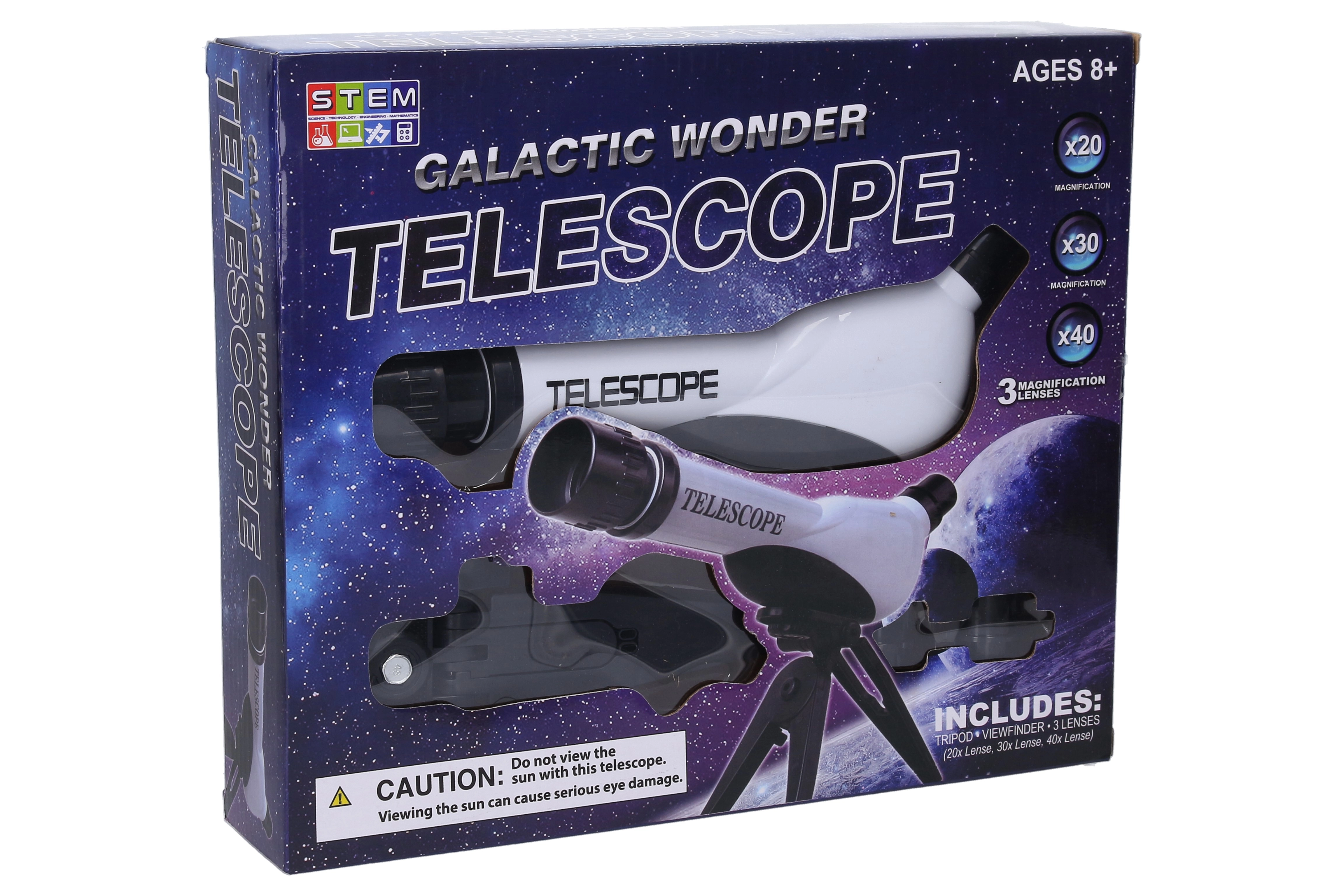 Udforsk nattehimlen med dette kompakte astronomiske teleskop til begyndere og nysgerrige børn. Det tilbyder 20×, 30× og 40× forstørrelse, udskiftelige linser til forskellige niveauer af zoom og et stabilt stativ til behagelig observation. Enkel fokusering ved at dreje objektivet gør det nemt at få et skarpt billede, som gennem teleskopet er spejlvendt (optisk egenskab).