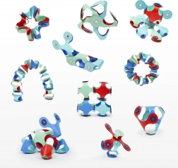 Særlige magnetiske hængsler muliggør 360° rotation og fiksering i 24 positioner for stabile kreationer. Delene er lavet af robust, genanvendeligt syntetisk papir, vandafvisende, lette at rengøre og fri for BPA og ftalater. Der medfølger en kreativ brochure samt online inspiration til flere byggerier. Perfekt til afslapning, anti-stress leg og udvikling af finmotorik.