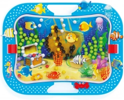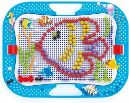 Denne kreative mosaikleg er ideel til førskolebørn og yngre skolebørn. Den perforerede plade er indsat i en solid ramme med afrundede kanter, hvilket gør den sikker og behagelig for børn at håndtere. Med de farvede knopper skaber børn sjove motiver fra havet – fra farvestrålende fisk til andre havdyr. Med både skabeloner og fri leg udvikler de fantasi og tålmodighed.