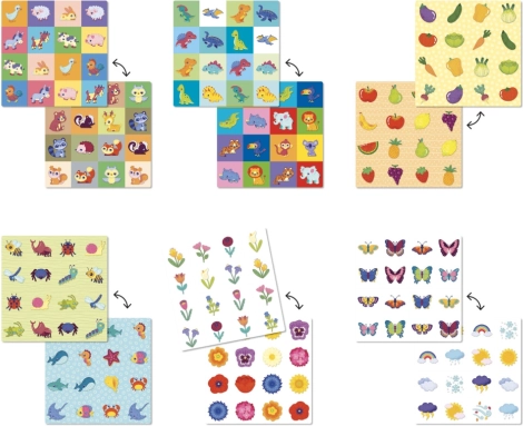 Seks dobbeltsidede kort med 192 billeder (dyr, frugter, blomster, havet og mere) fastholder børns opmærksomhed og tilbyder utallige kombinationer til leg.