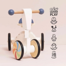 Dette stilfulde køretøj er håndmalet med miljøvenlige, vandbaserede farver og opfylder de strengeste sikkerhedsstandarder. Regnbuefarvede hjul af blød gummi sikrer en stille og skånsom kørsel på gulvet. Løbecyklen fremmer aktiv bevægelse, kognitive færdigheder og fantasifuld leg.