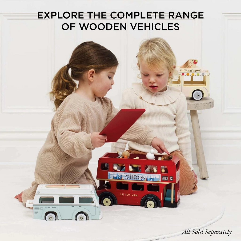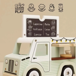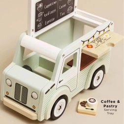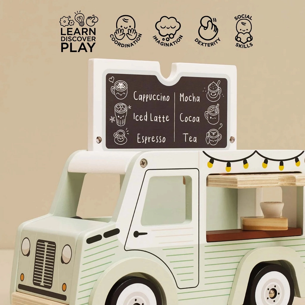 Den stilfulde mobile café fra Le Toy Van vil glæde små baristaer med sit retrodesign og sin kvalitet i FSC-certificeret træ. Den tilbyder en åbnbar tagmarkise, et udsalgsvindue og en serveringsbakke med tilbehør til realistisk leg. Den er hånddekoreret med ikke-giftige vandbaserede farver og understøtter kreativitet og rolleleg.