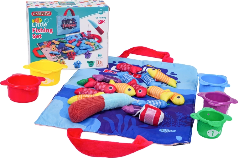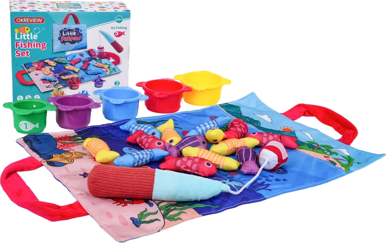 Dette bløde, sanselige fiskesæt er designet til børn fra cirka 6 måneder. Den farverige tekstilmåtte med havtema, de bløde fisk i fem farver, fem kopper med tallene 1–5 og en blød fiskestang med velcro indbyder til sikker og sjov leg. Børn fanger fiskene, fordeler dem i kopper efter farve og øver samtidig at tælle efter tallene på kopperne.