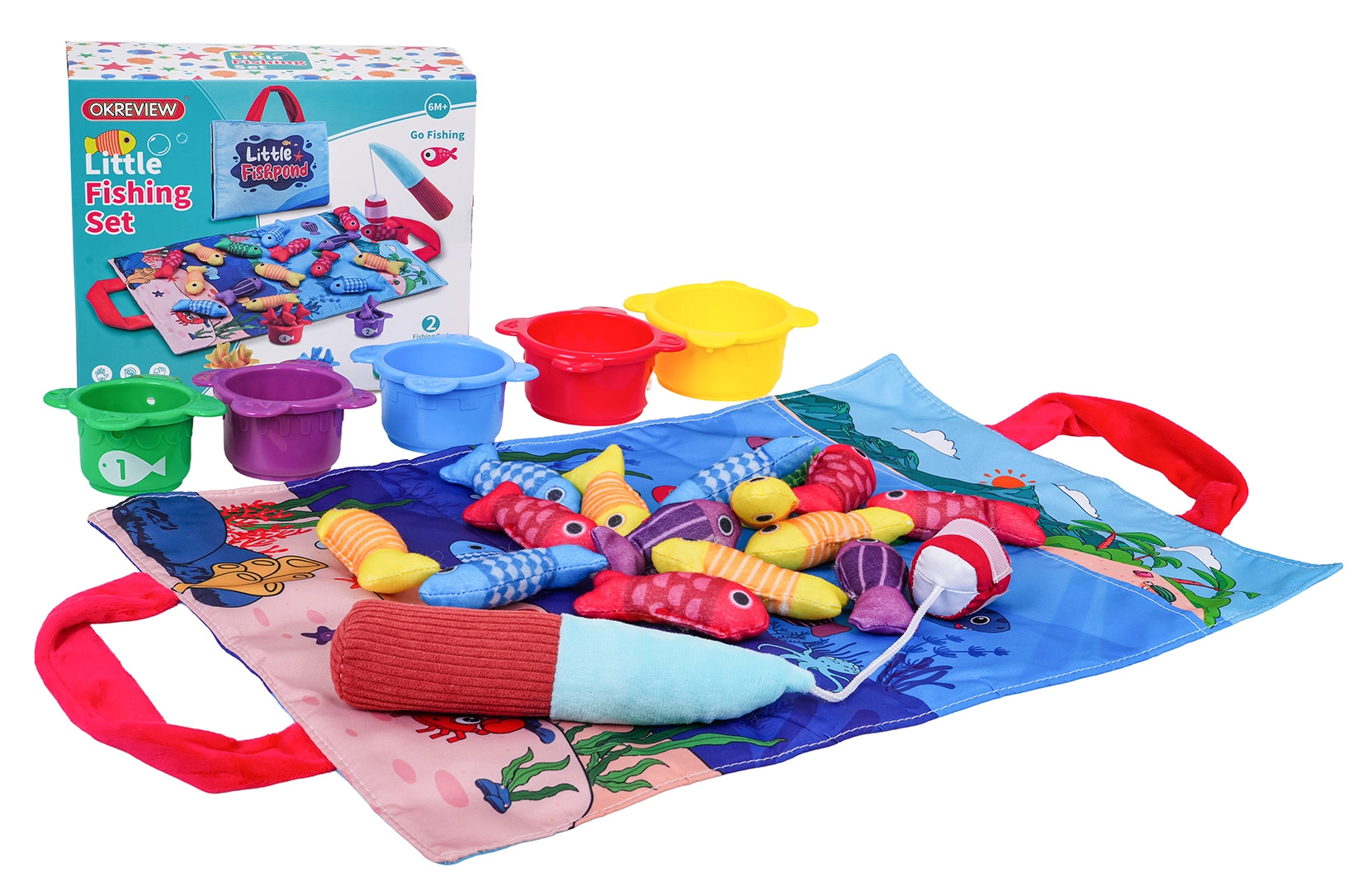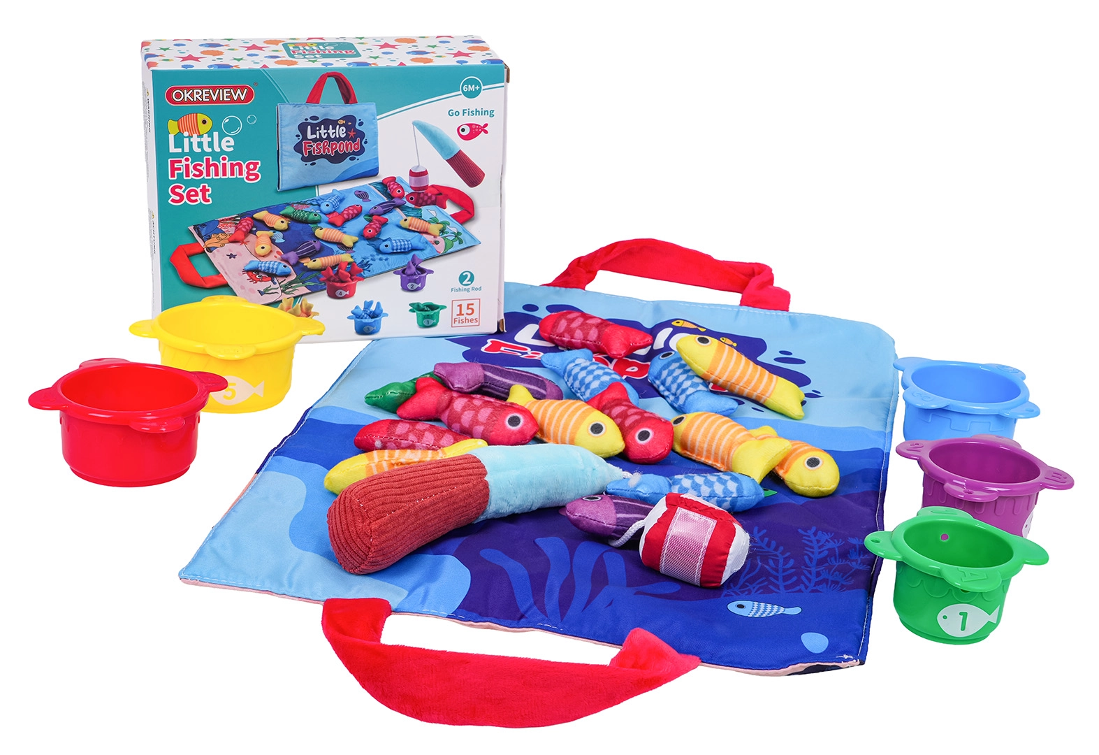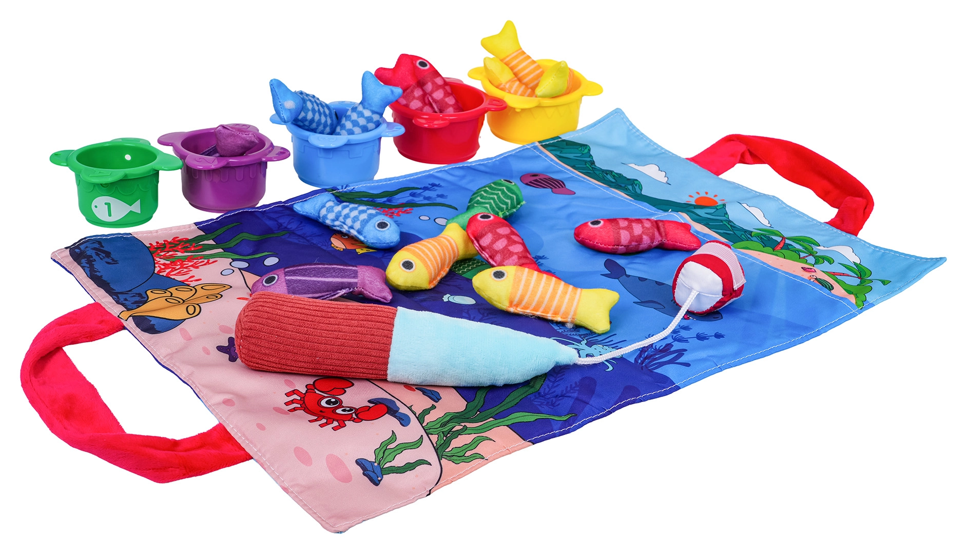 - stofmåtte med håndtag, 15 bløde fisk (5 gule, 4 røde, 3 blå, 2 lilla, 1 grøn), 5 kopper (rød, gul, blå, grøn, lilla), blød stang med velcro
