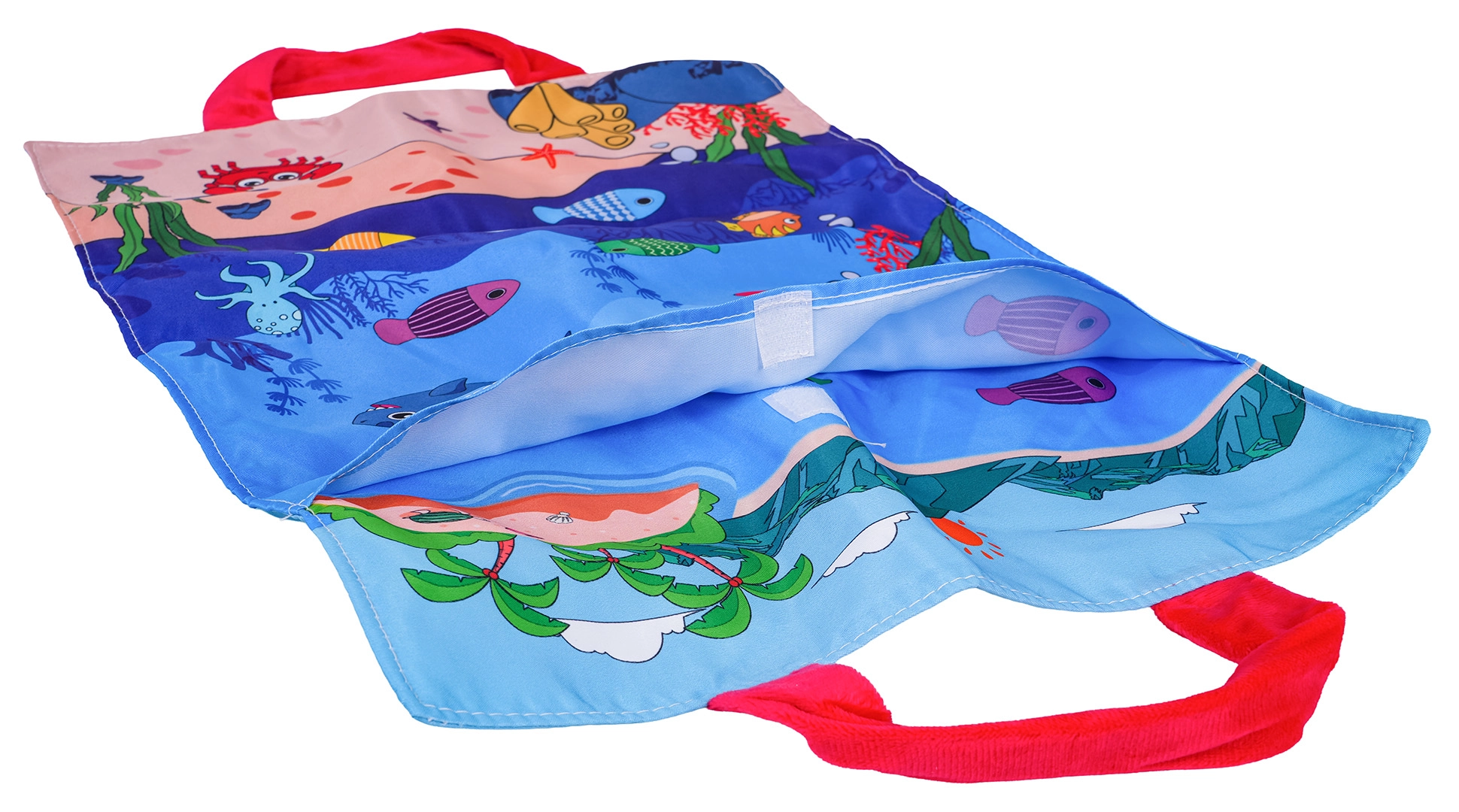 Måtten med havmotiv har indsyede håndtag og kan bruges som bæretaske. Alle dele pakkes nemt sammen og kan tages med på tur eller besøg.
