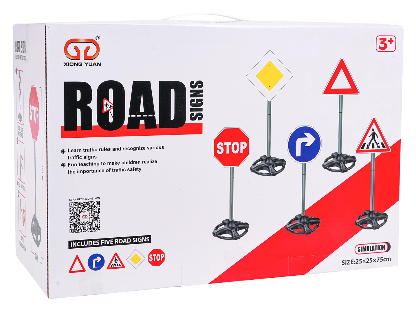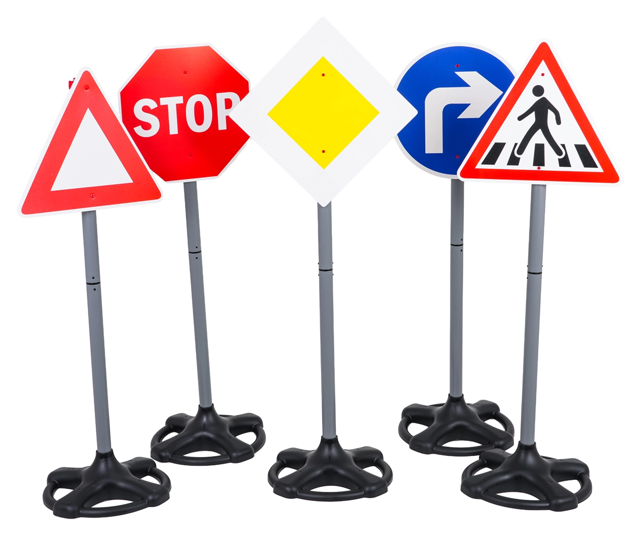 Denne mega-sæt indeholder fem realistiske trafikskilte i en højde på ca. 75 cm. Børn lærer gennem leg de grundlæggende sikkerhedsregler og at orientere sig i trafikken. Den robuste, lette plastkonstruktion med stabile, vægtede sokler sikrer sikker brug både inde og ude.