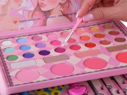 Rige kollektioner af øjenskygger, blush og lipgloss arrangeret i overskuelige pander inspirerer til kreativitet og finmotorik.