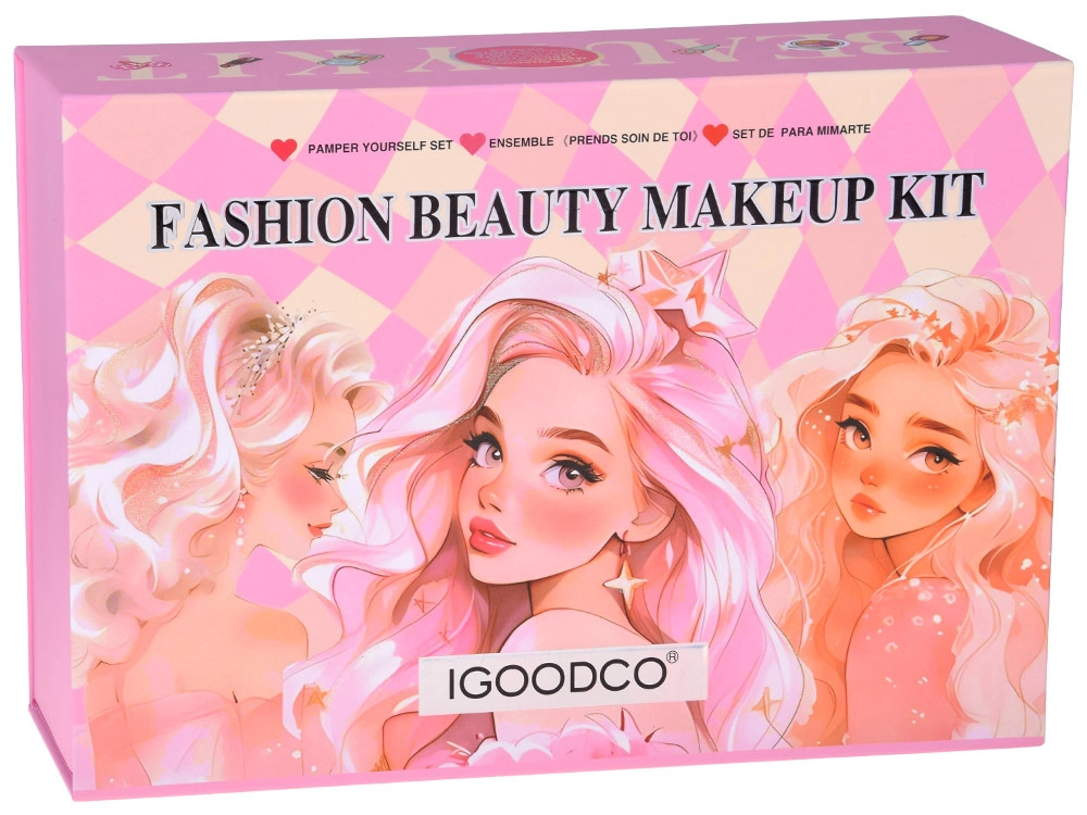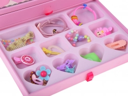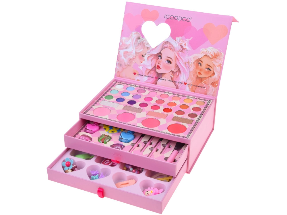 En stilfuld lyserød kuffert med udskåret hjerte og søde illustrationer folder sig ud i flere etager og forvandler ethvert børneværelse til en lille beauty-salon. Øverste etage byder på en farverig palet af øjenskygger, blush og glimmer til legende fantasi. I skufferne finder du både pensler, lakker, fil og tåseparator til neglene samt magiske elastikker, spænder, ringe og armbånd til at fuldende outfittet.