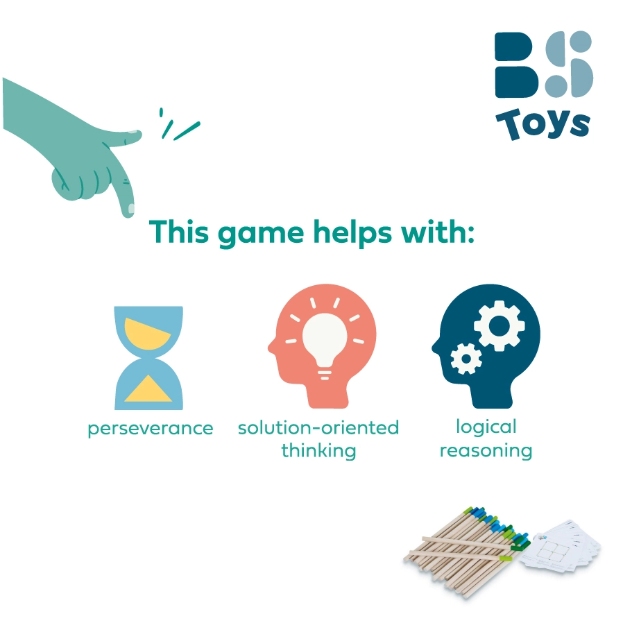Denne logiske leg med træpinde giver klog og tålmodighedsudviklende underholdning for hele familien. Vælg en opgave fra kortet, læg den ønskede form med pindene, og tjek løsningen på bagsiden af kortet. Takket være den gradvist stigende sværhedsgrad vender I gerne tilbage til udfordringerne igen og igen.