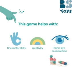 Oplev en sjov motorisk leg, der naturligt fører børn til at træne fingerfærdighed og tålmodighed. De store træperler i forskellige former og farver er lette at gribe og trække på en snor med træender. Aktiviteten stimulerer udvikling af finmotorik, hånd-øje-koordination og farvegenkendelse.