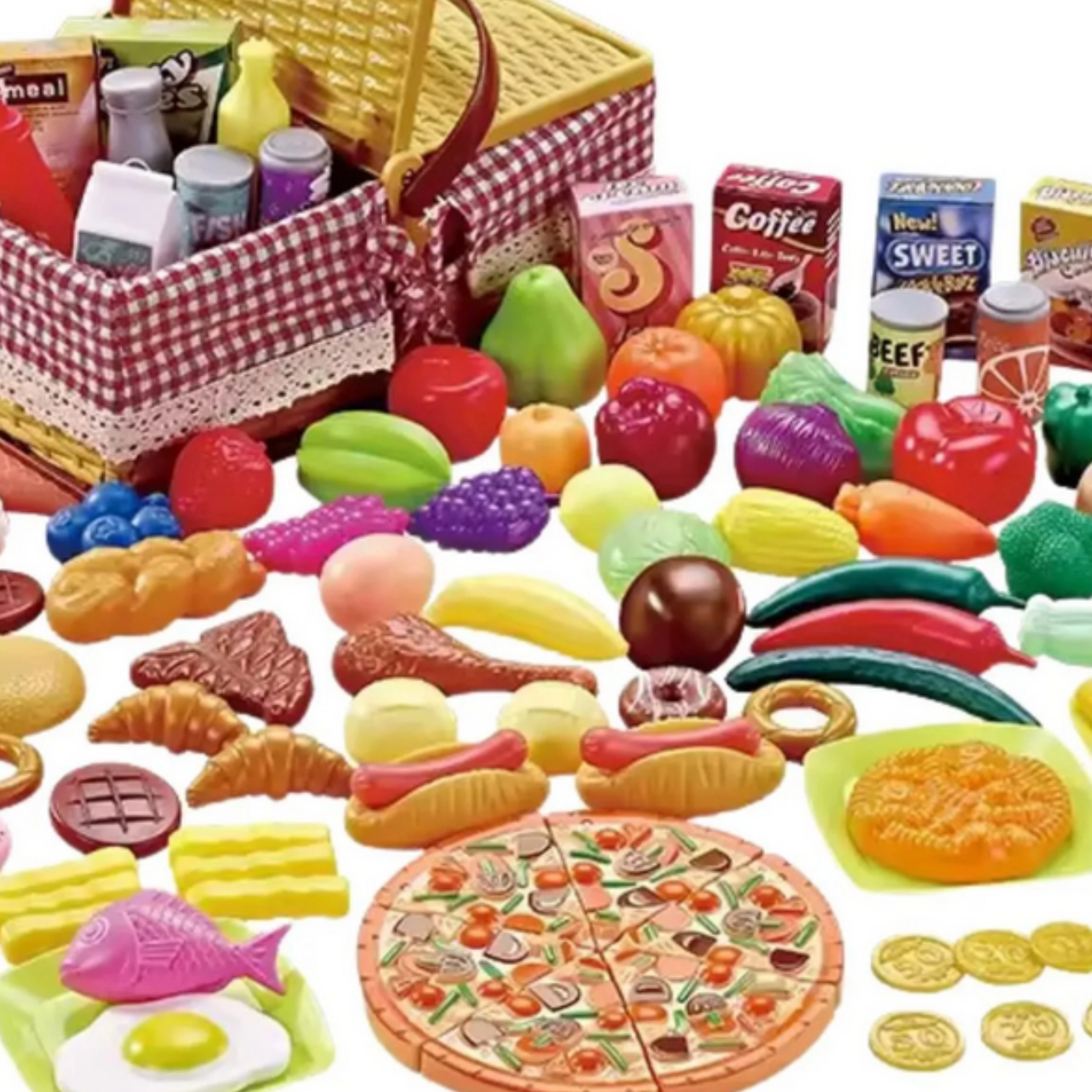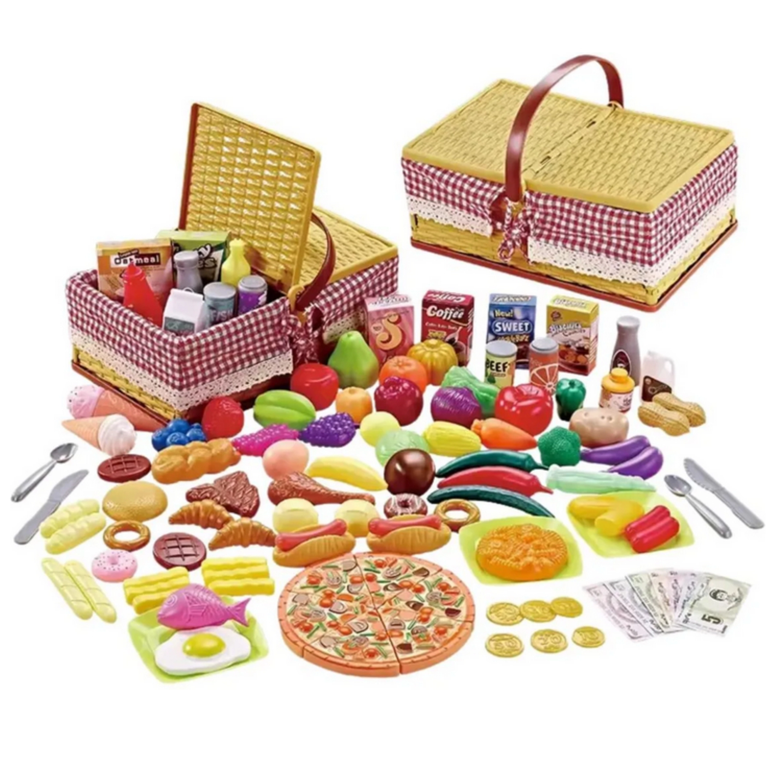 I pakken finder du et bredt udvalg af madvarer og tilbehør – fra pizza skåret i stykker over frugt og grøntsager til desserter, drikkevarer og bestik. Der medfølger også sedler og mønter til butikleg, som udvikler logisk tænkning og tællefærdigheder.