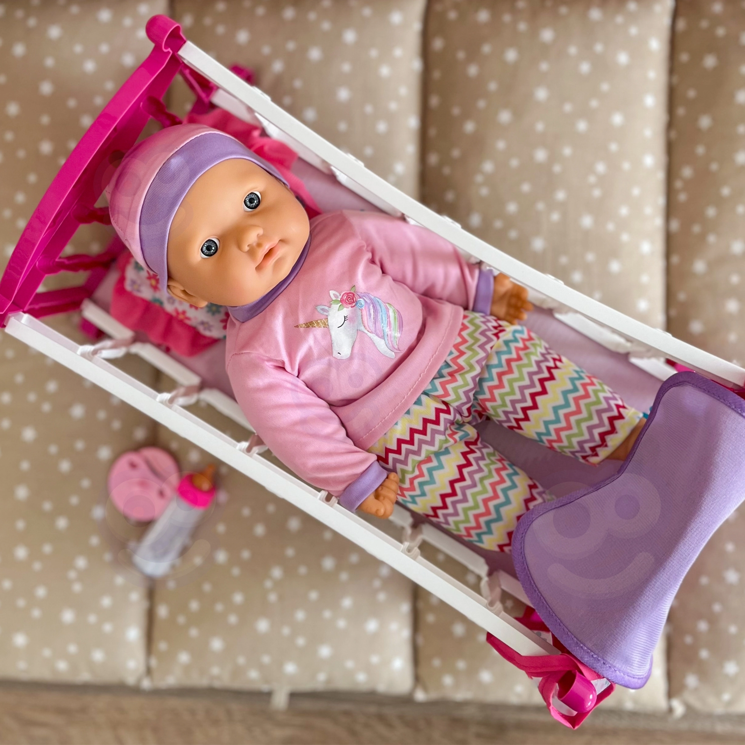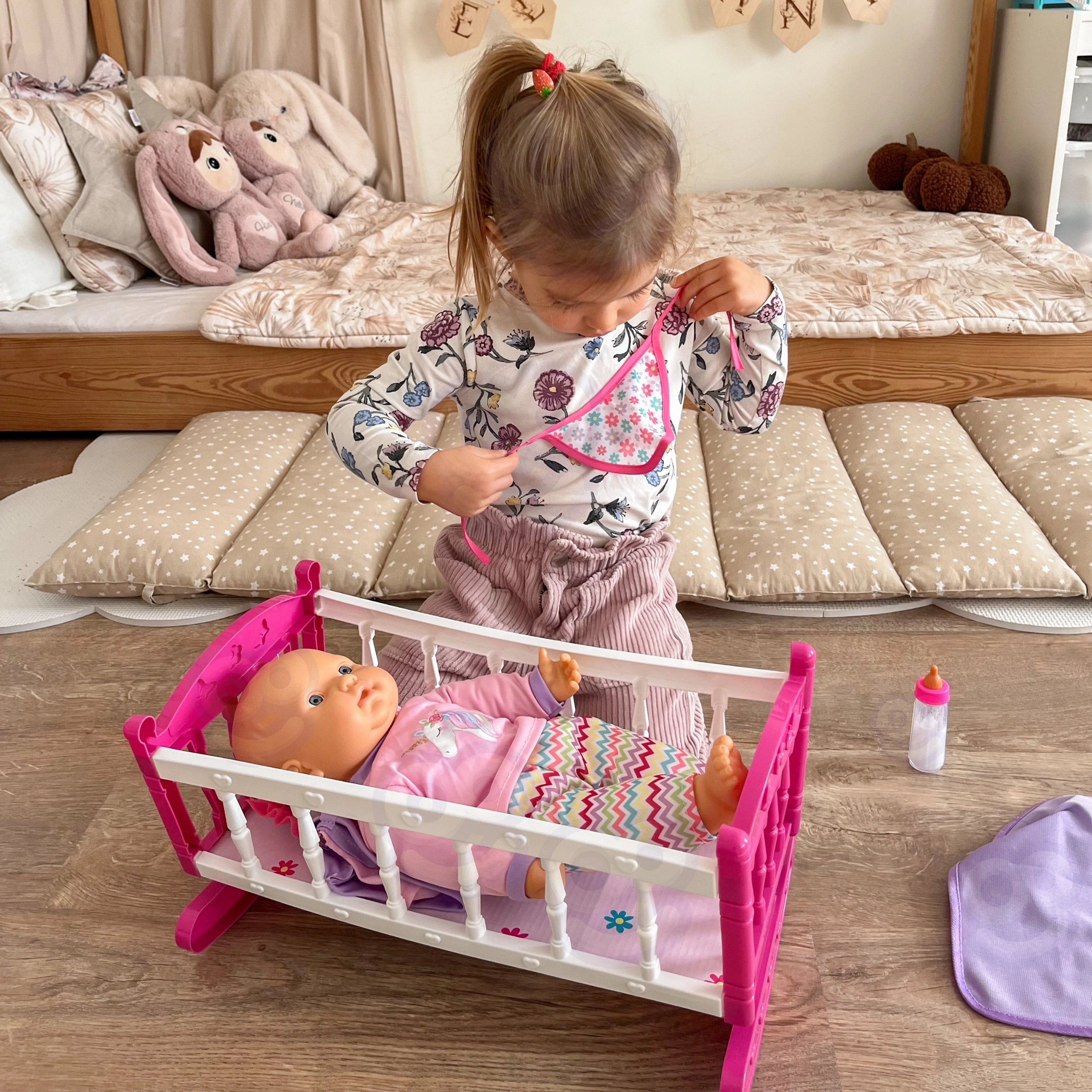 Den rosa-hvide vugge med udskårne sider og buede meder gynger blidt og hjælper med at “lulle” dukken i søvn. Let, stabil og nem at flytte.